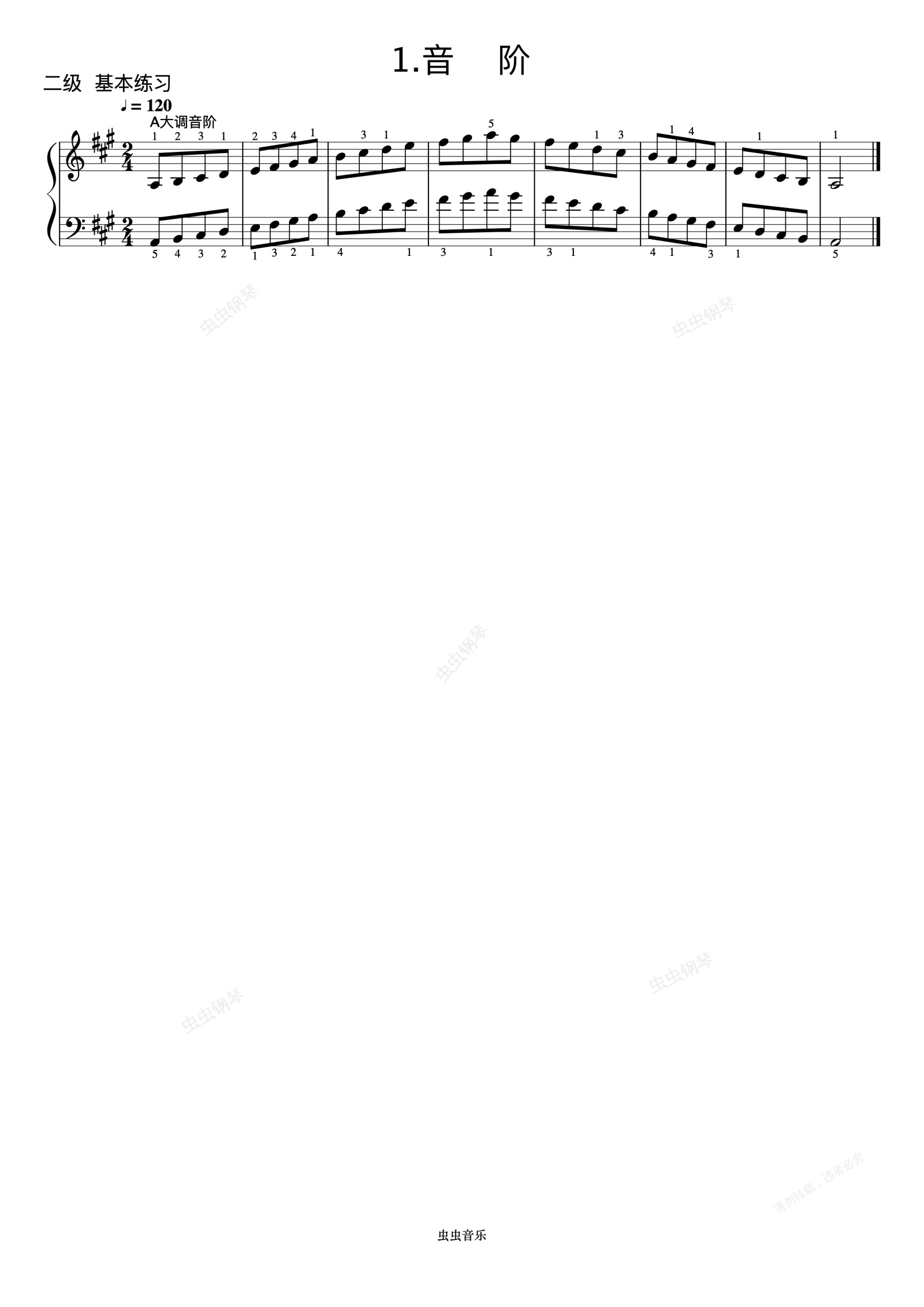 钢琴谱: A大调音阶《 ZYY 钢琴考级曲目 1》