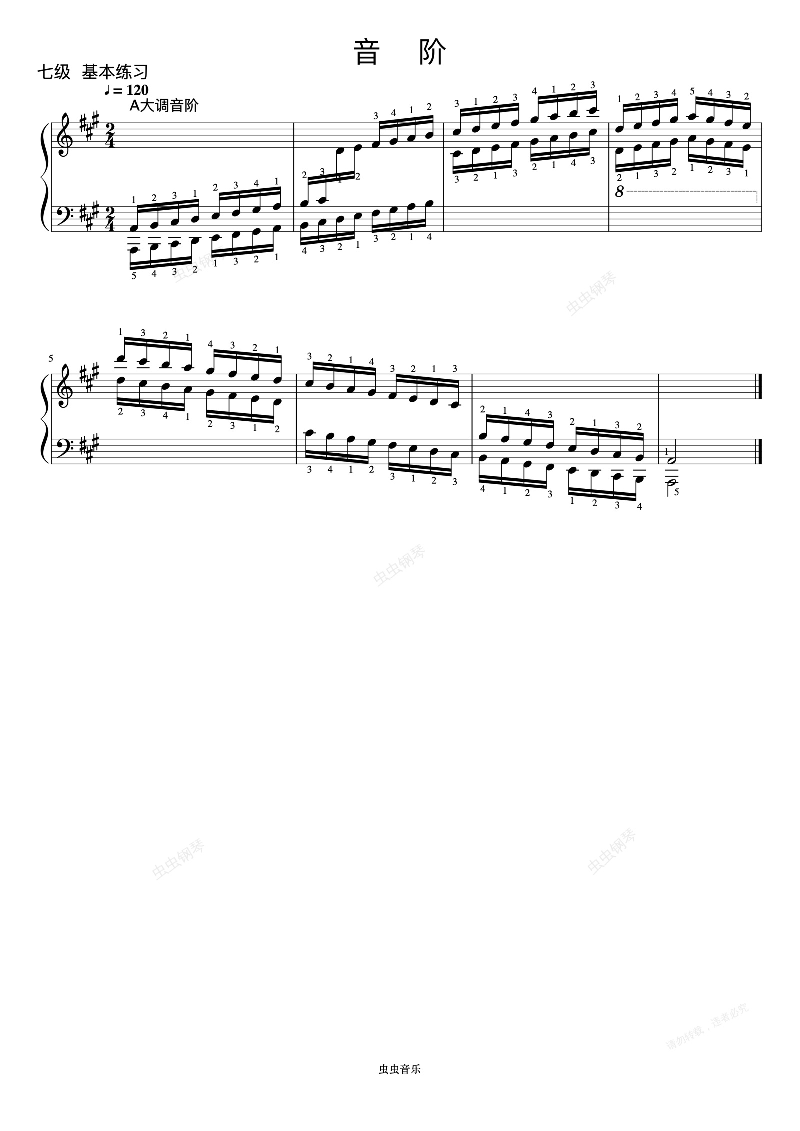 钢琴谱: A大调音阶《 ZYY 钢琴考级曲目 7》