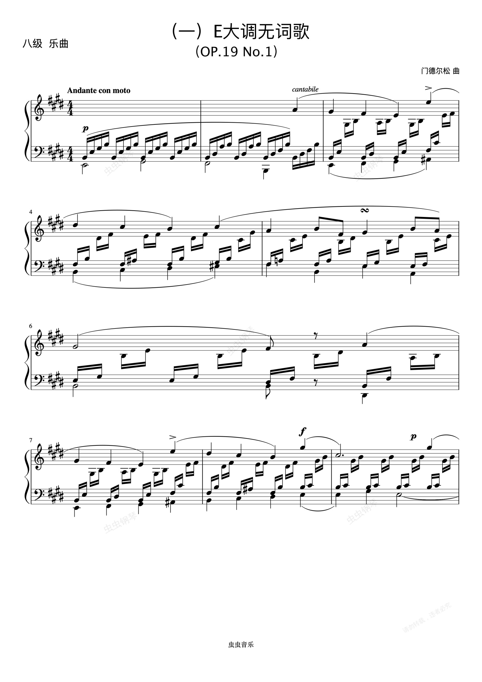 钢琴谱:8级 E大调无词歌(Op.19 No.1)《音协钢琴考级曲目 6-8级》