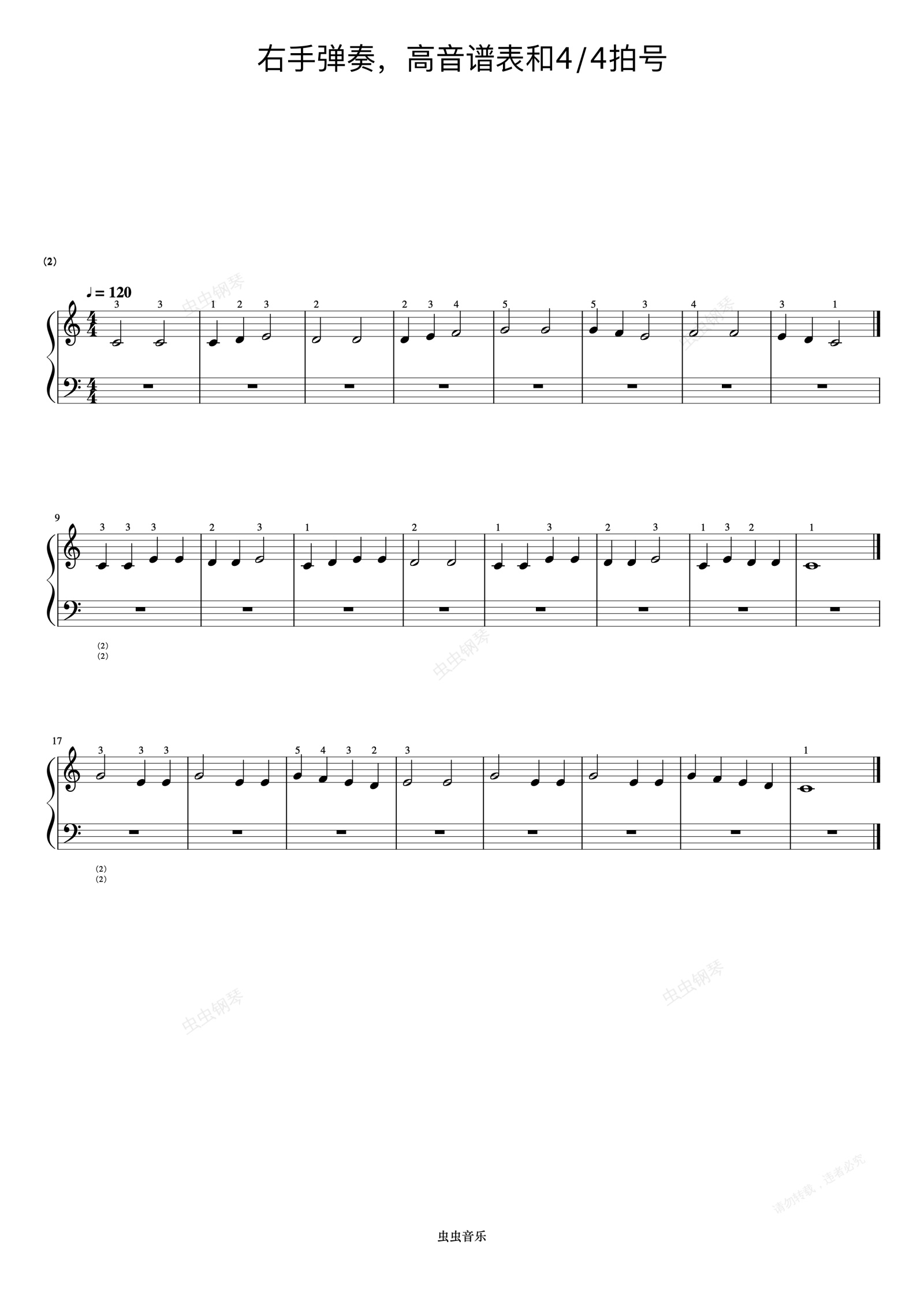 钢琴谱:右手弹奏,高音谱表和44拍号