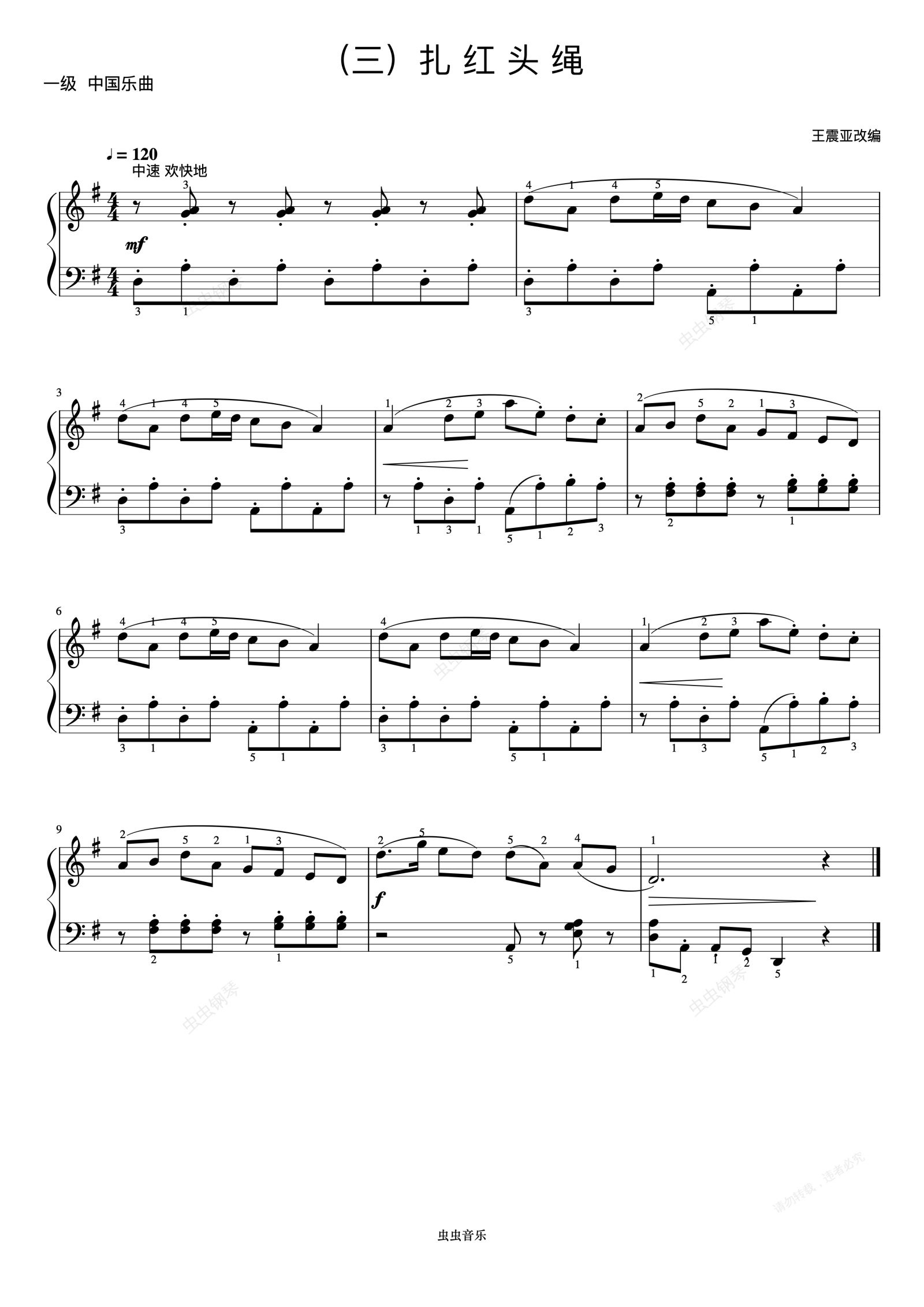 钢琴谱:1级 扎红头绳《音协钢琴考级曲目 1-5级》