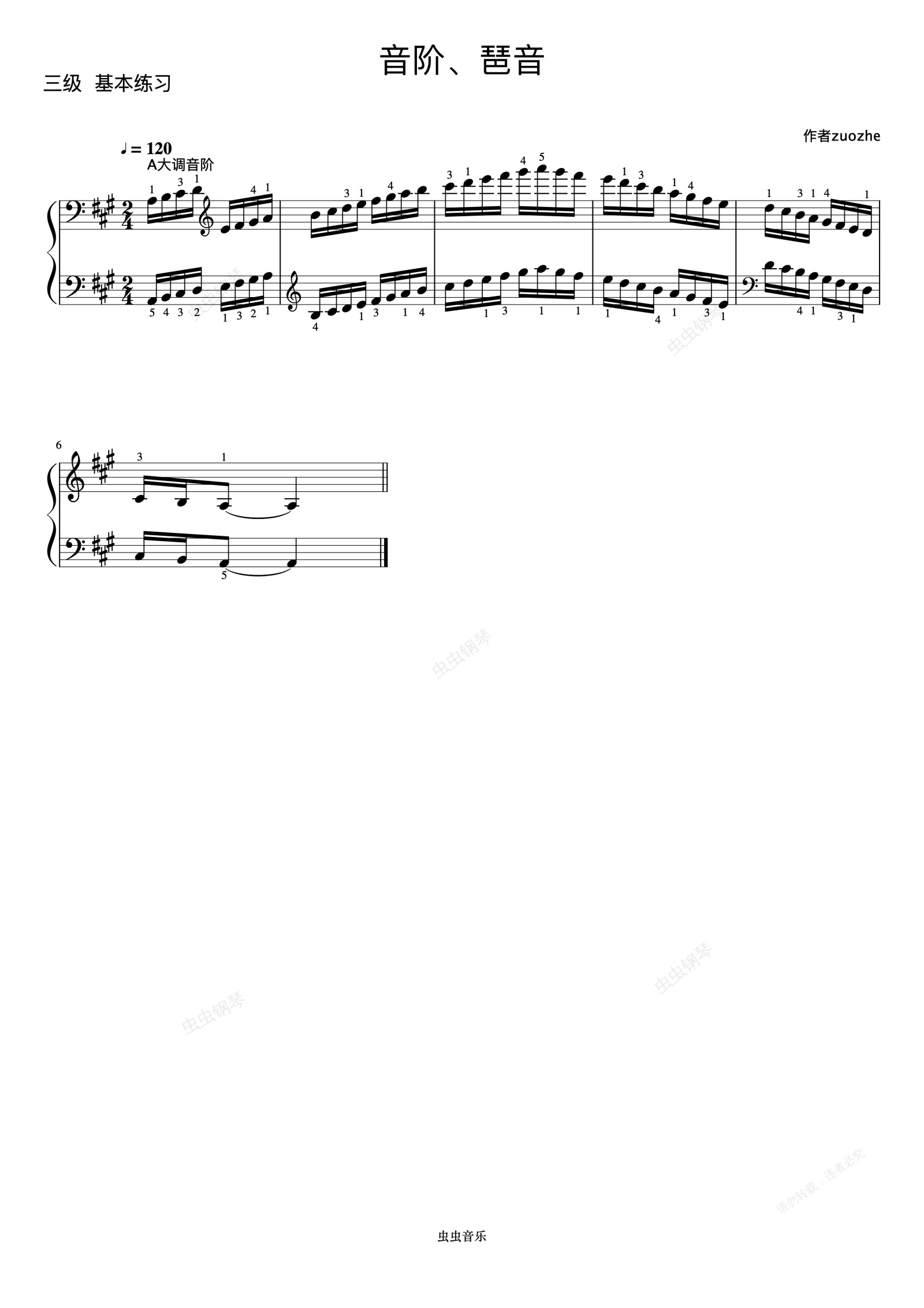 钢琴谱:3级 A大调音阶《中国院钢琴考级曲目》