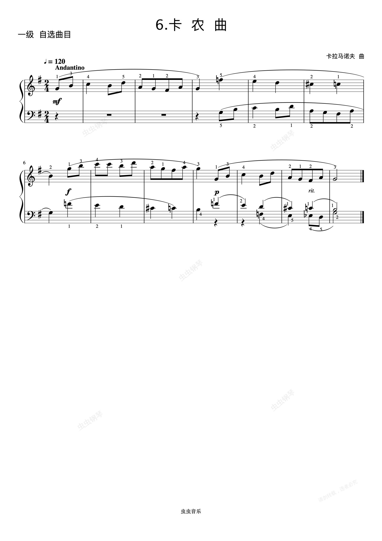 钢琴谱:1级 卡农曲《中国院钢琴考级曲目》