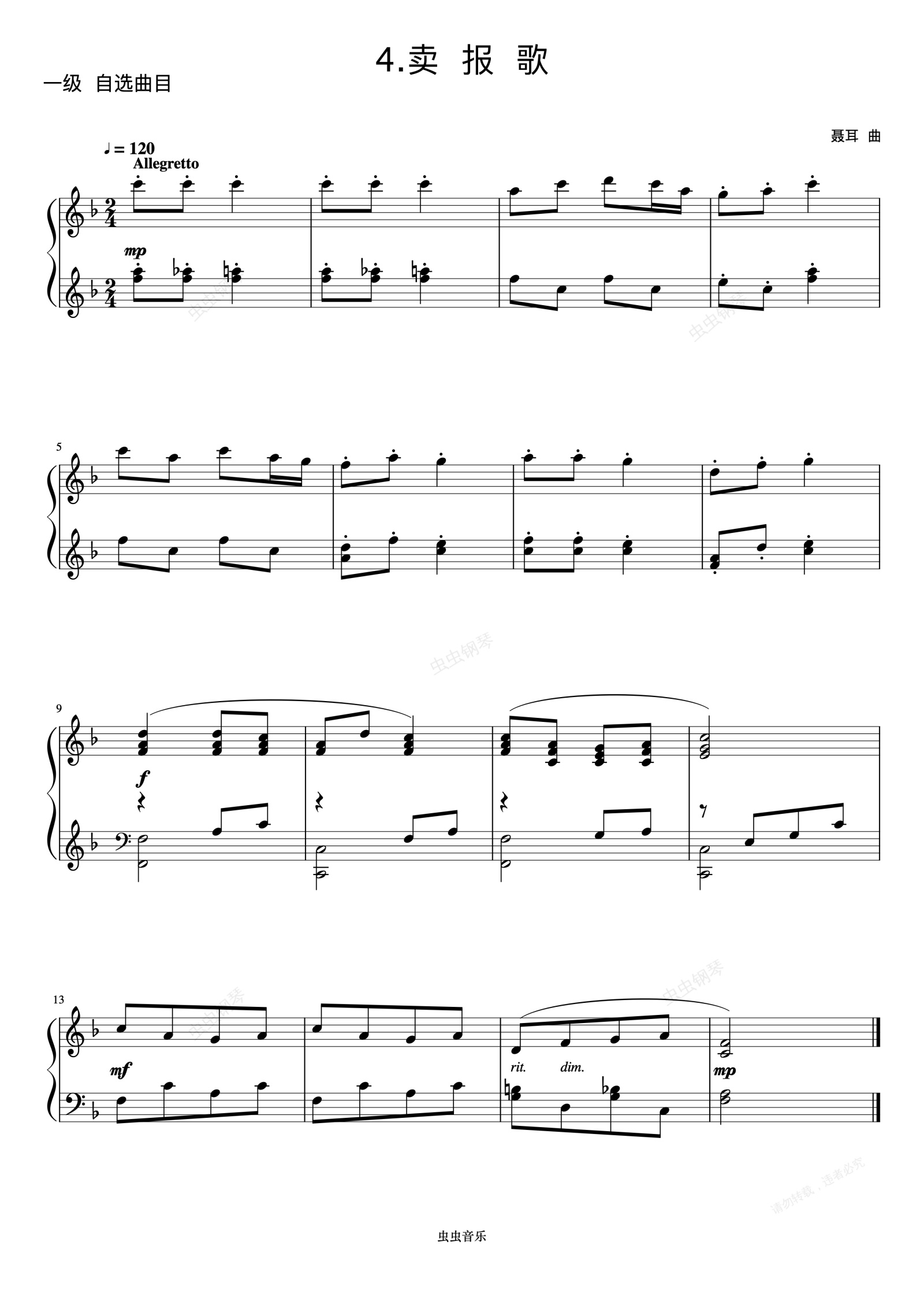 钢琴谱:1级 卖报歌《中国院钢琴考级曲目》