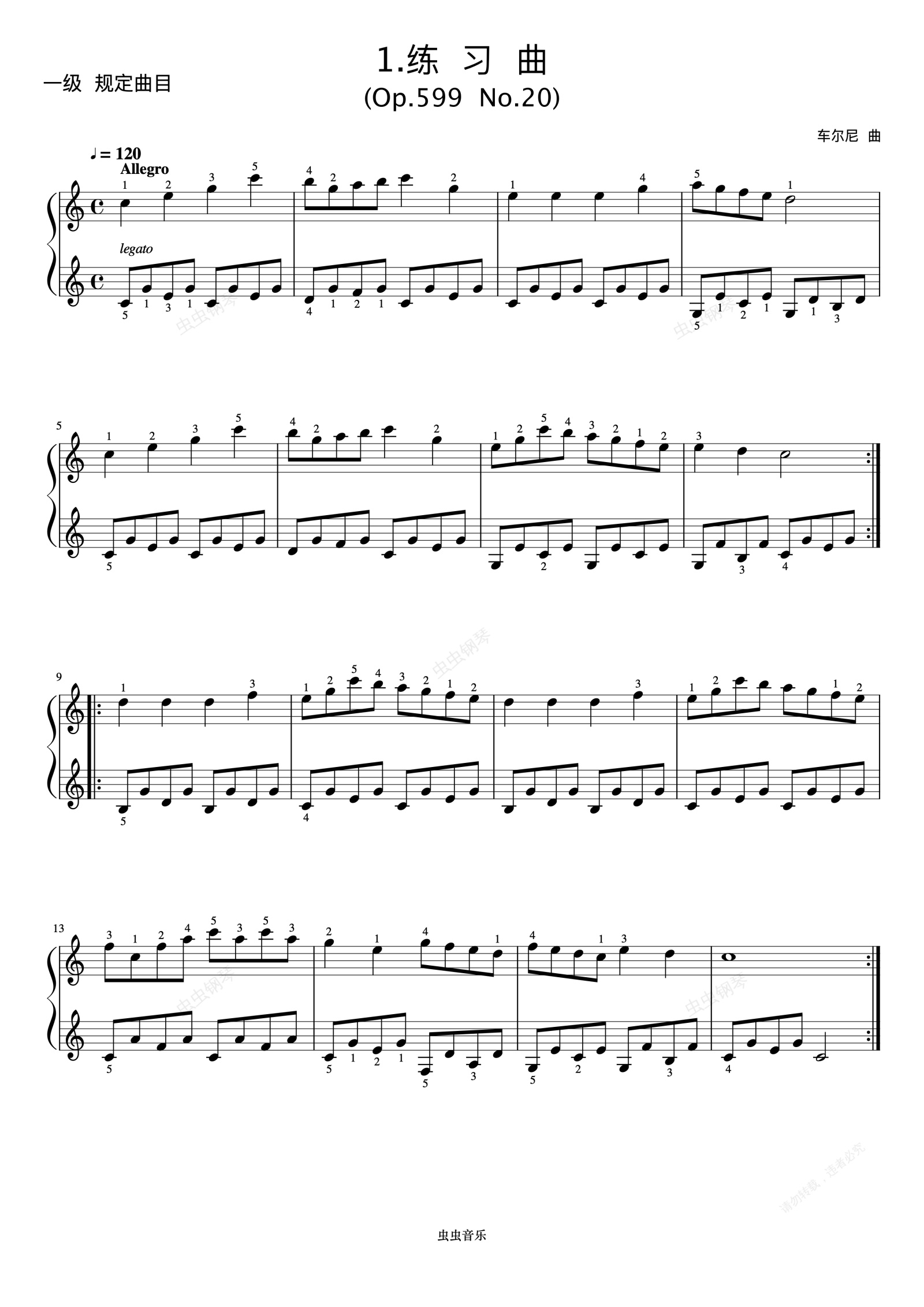 钢琴谱:1级 练习曲(Op.599 No.20)《中国院钢琴考级曲目》