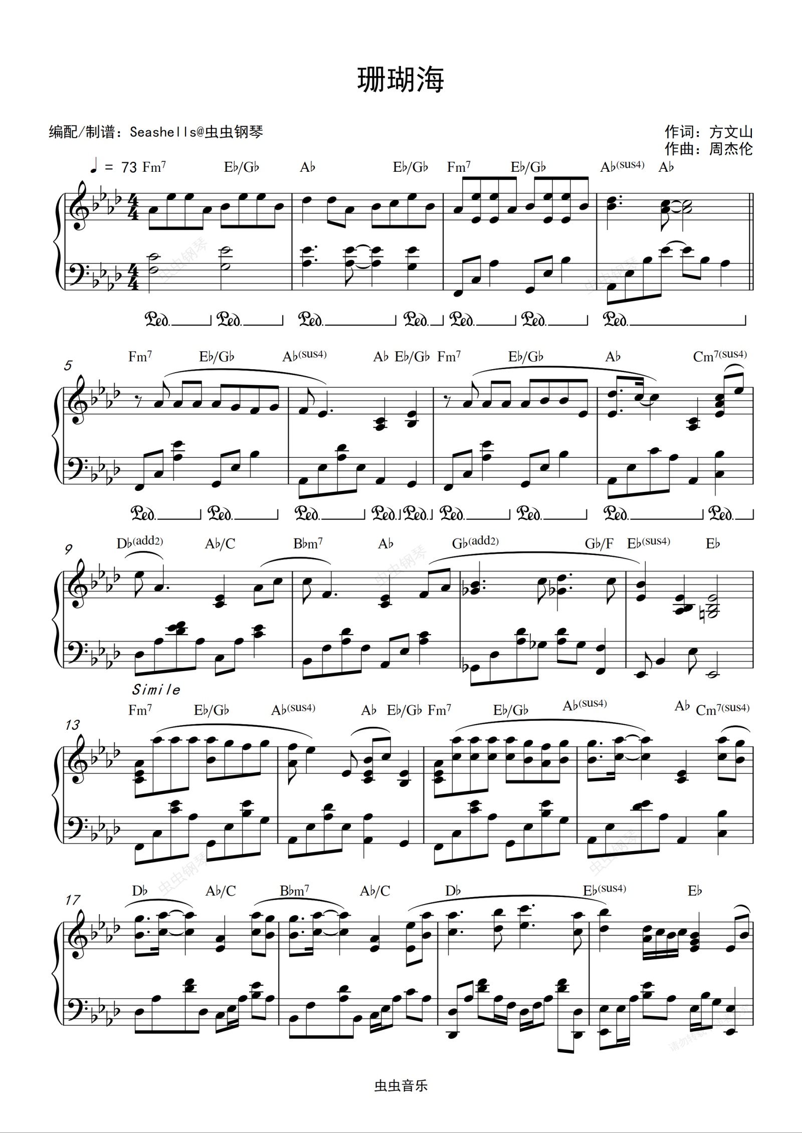 钢琴谱:周杰伦&梁心颐-《珊瑚海》精编钢琴独奏