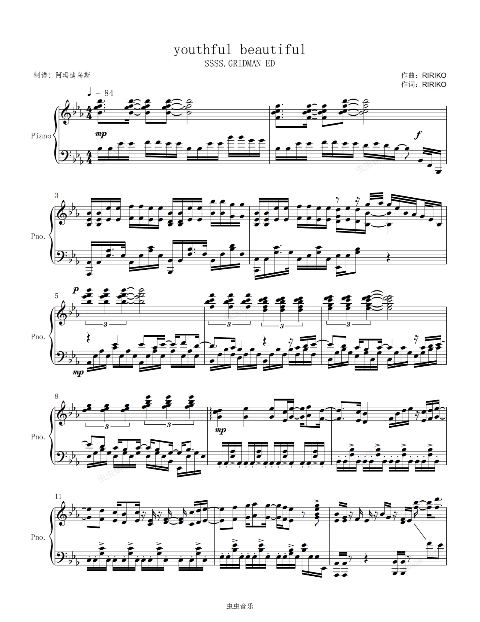 钢琴谱:SSSS.GRIDMAN 電光超人古立特 ED < youthful beautiful > 原调高还原完整版本