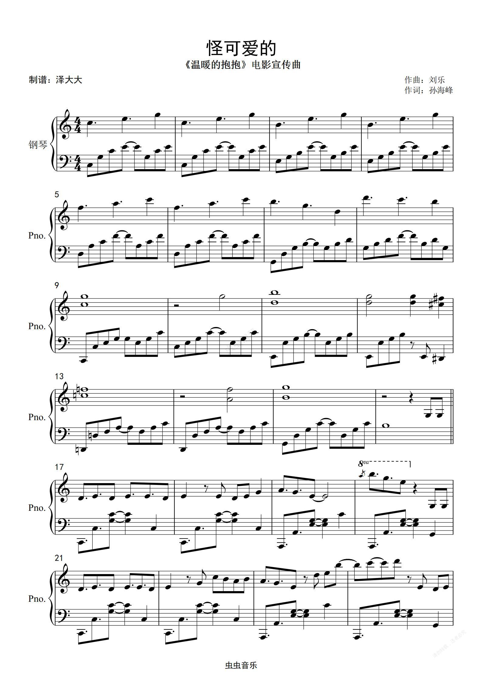 钢琴谱:怪可爱的【C调独奏】《温暖的抱抱》电影宣传曲
