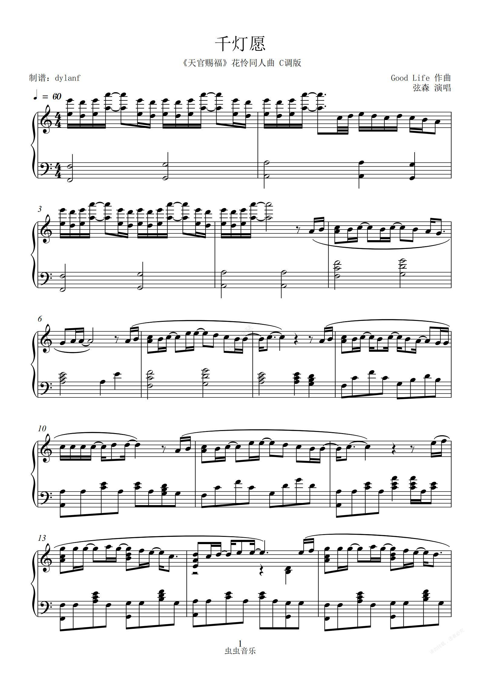 钢琴谱:C调易弹 千灯愿《天官赐福》花怜同人