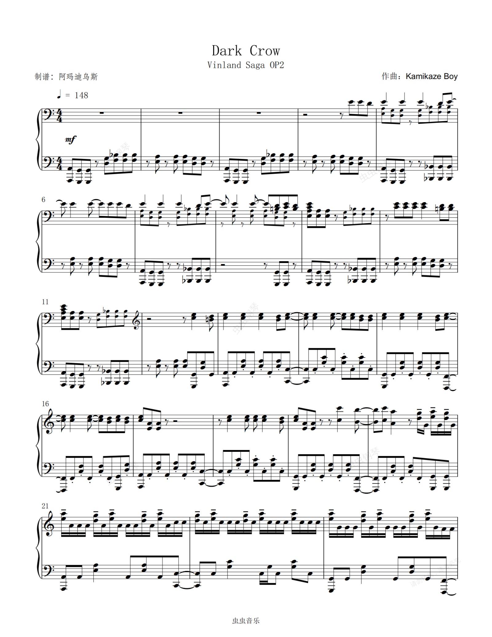 钢琴谱:冰海战记 OP < Dark Crow > 原调高还原完整版本