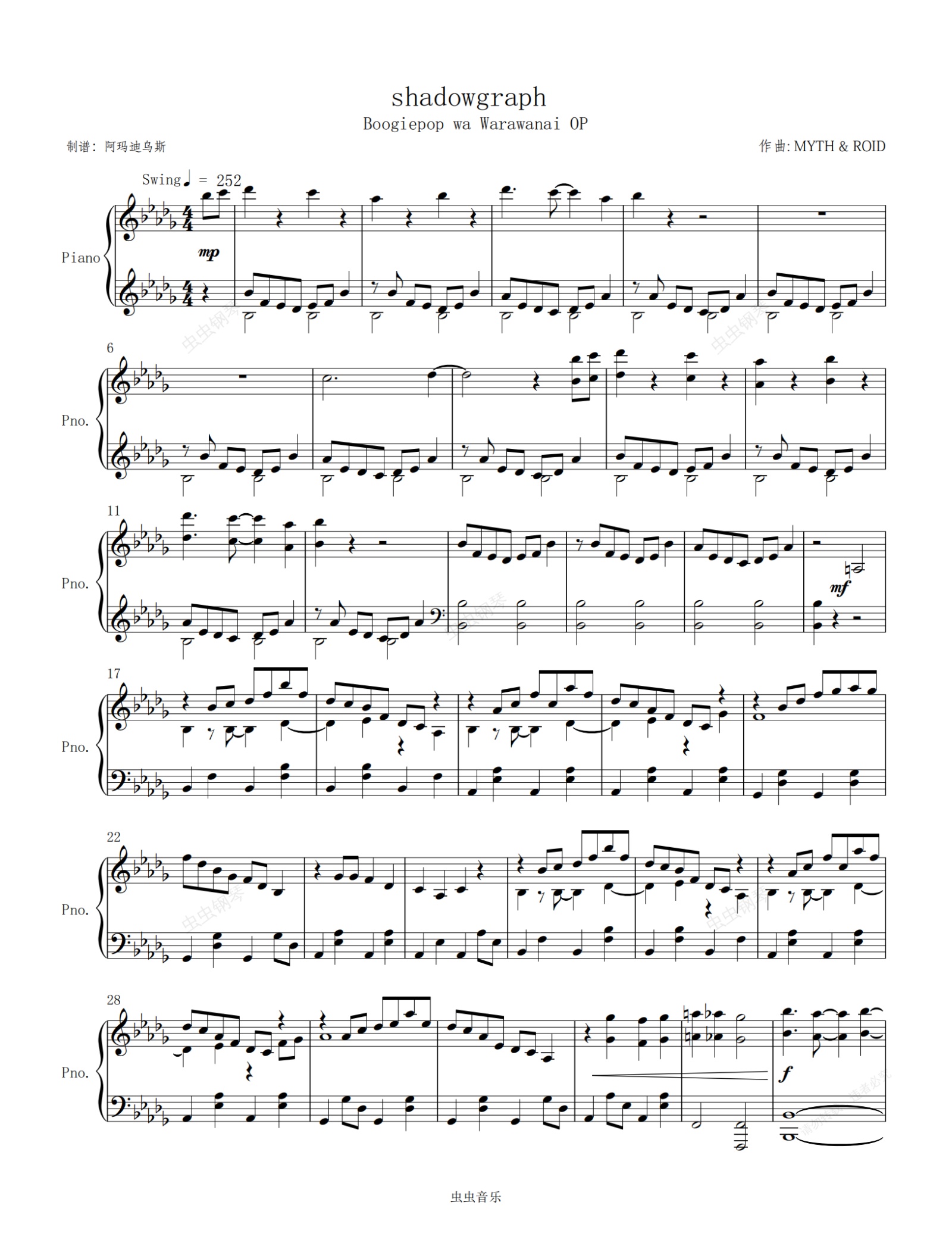 钢琴谱:不吉波普不笑 OP < shadowgraph > 原调高还原完整版本