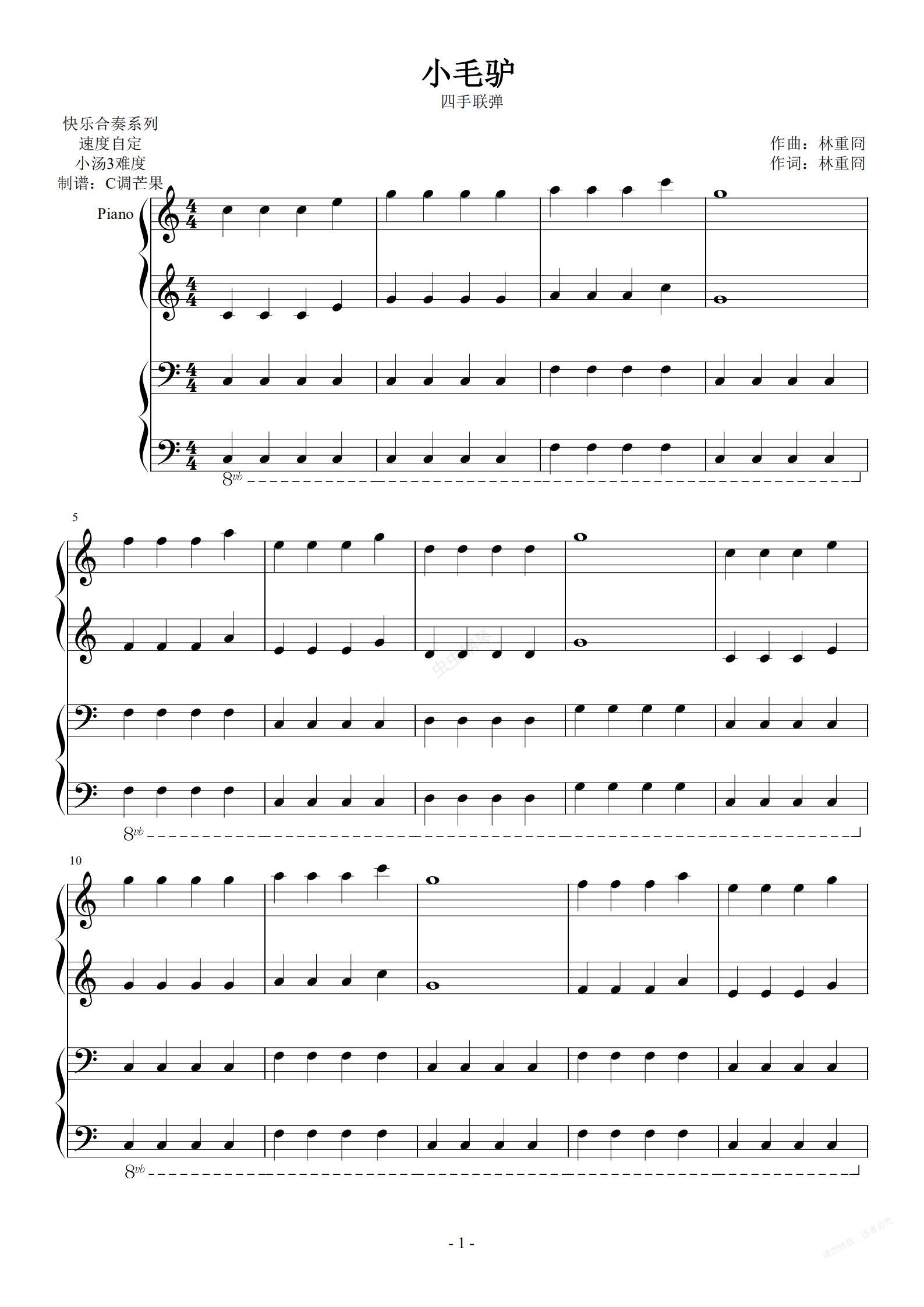 钢琴谱:《小毛驴》四手联弹 小汤3 难度