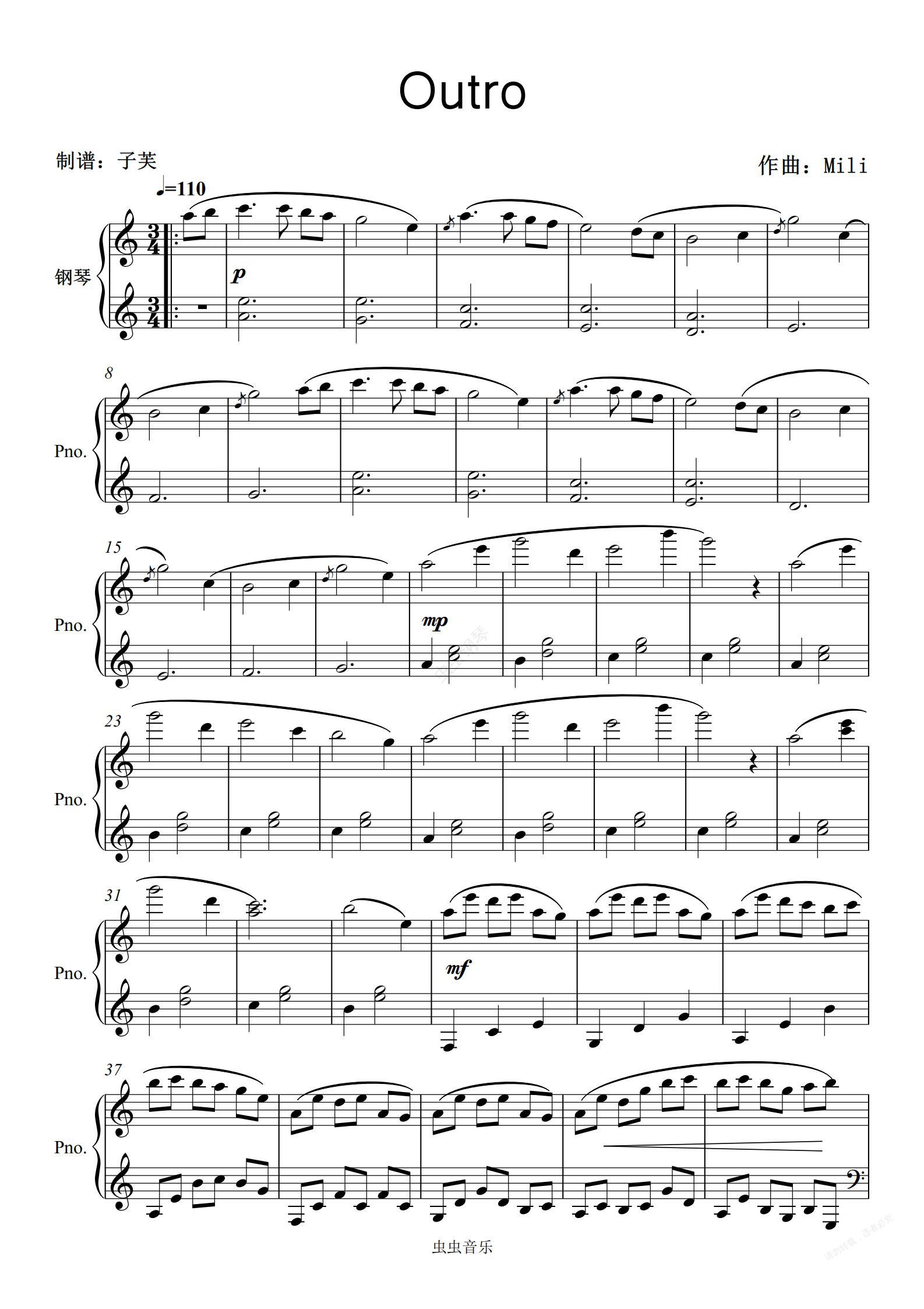 钢琴谱:《Outro》-Mili-唯美钢琴独奏