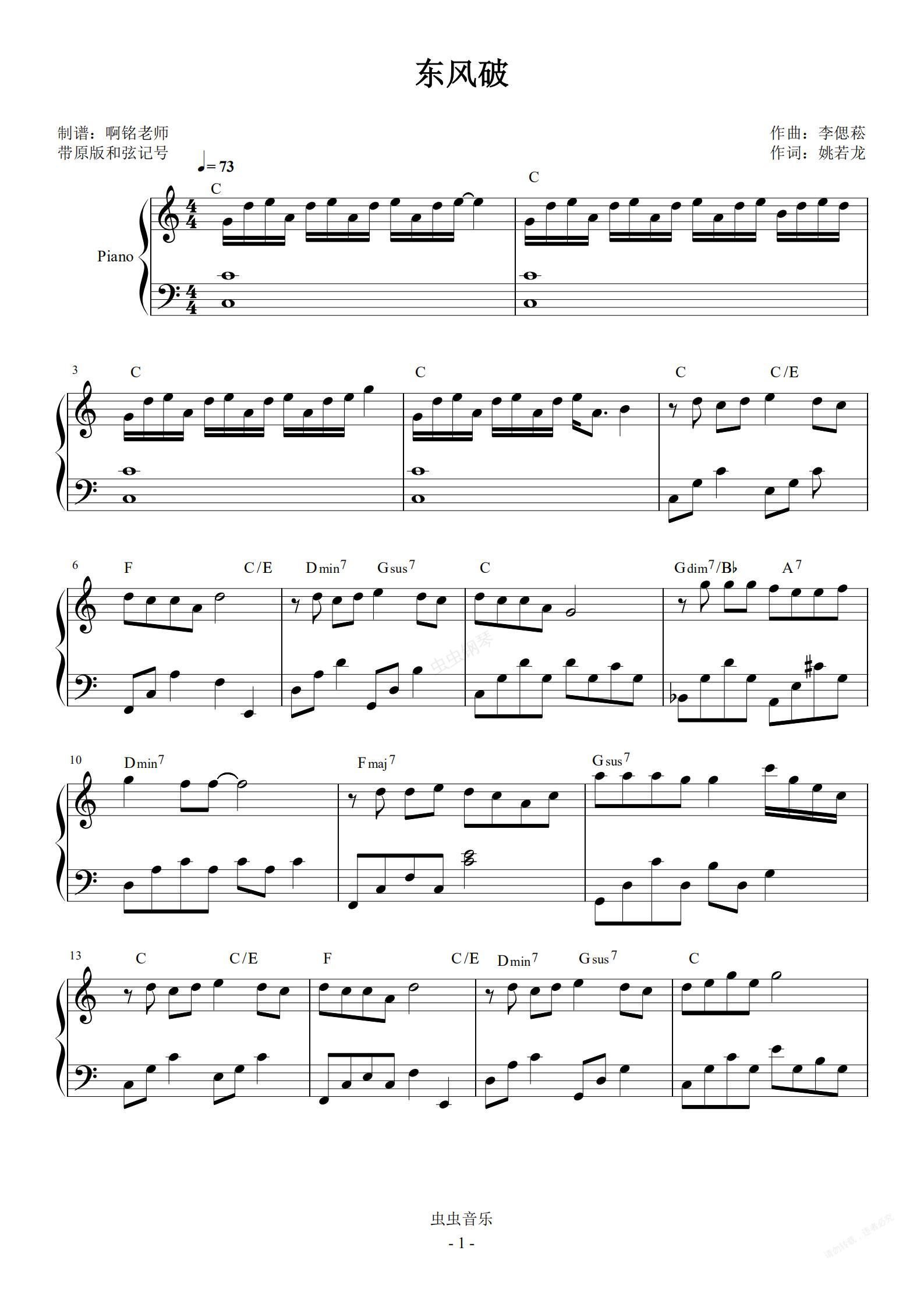 钢琴谱:《东风破》C调完美弹奏 带原版和弦记号