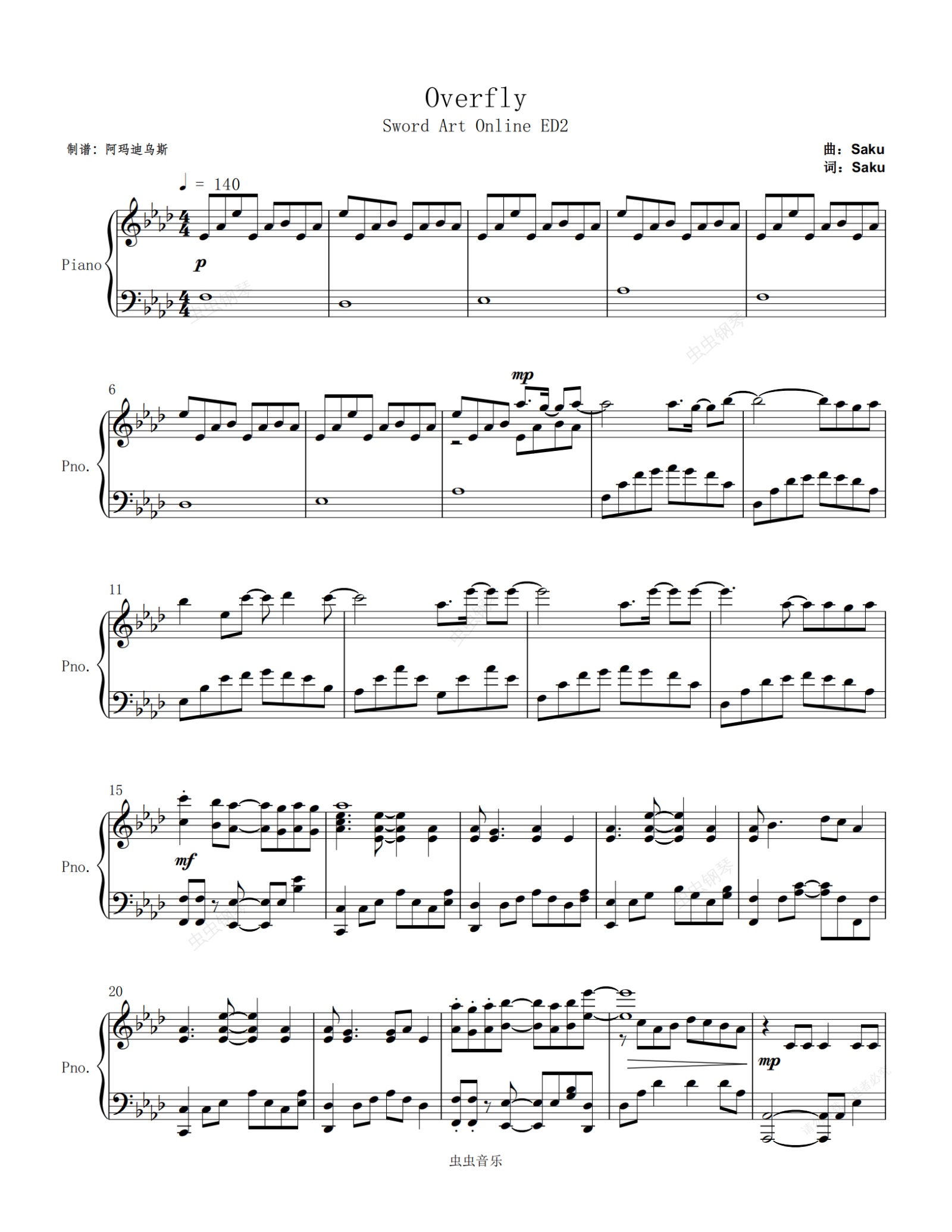 钢琴谱:刀剑神域 ED2 < Overfly > 原调高还原完整版本