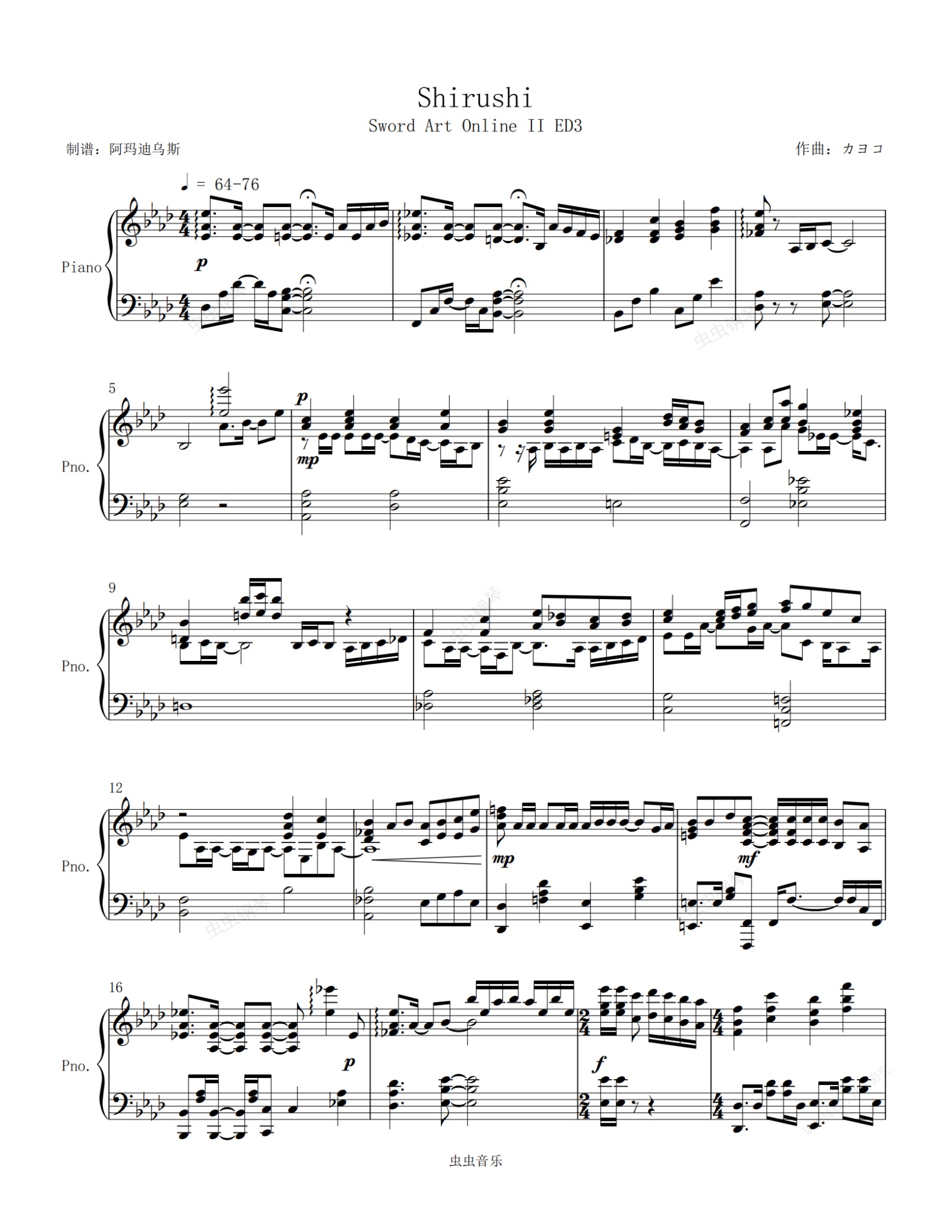 钢琴谱:刀剑神域 ED3 < Shirushi > 原调高还原完整版本