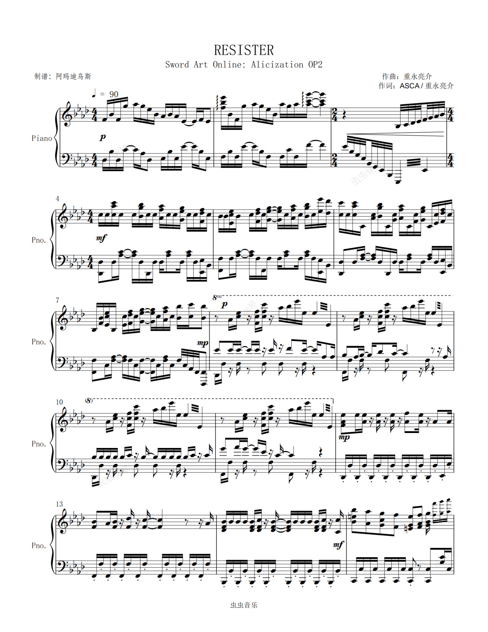 钢琴谱:刀剑神域 OP < RESISTER > 原调高还原完整版本