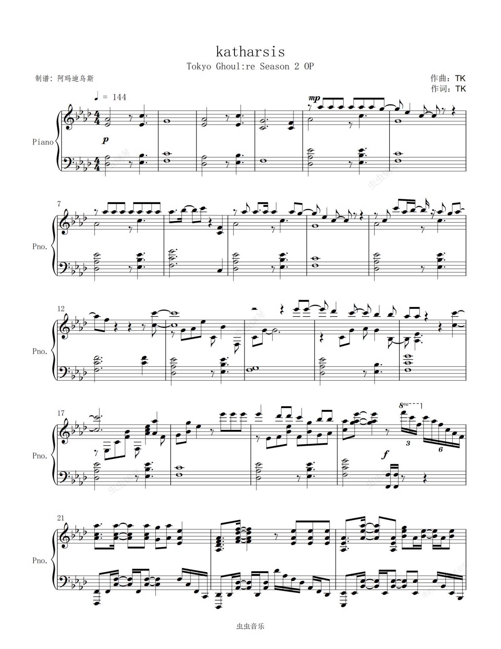 钢琴谱:东京喰种 东京食尸鬼 OP < katharsis > 原调高还原完整版本