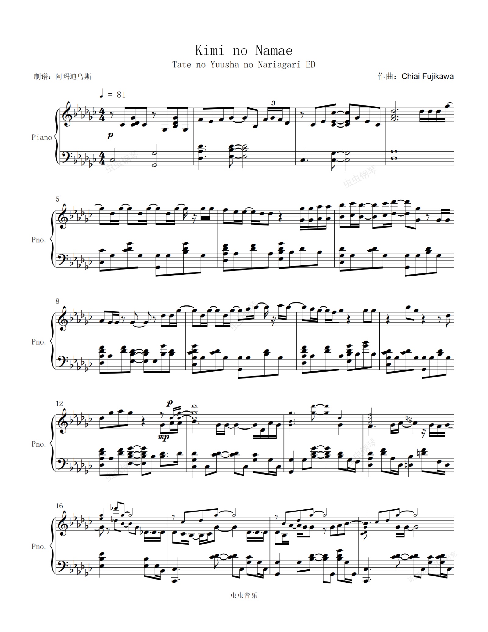 钢琴谱:盾之勇者成名录 ED < Kimi no Namae > 原调高还原完整版本