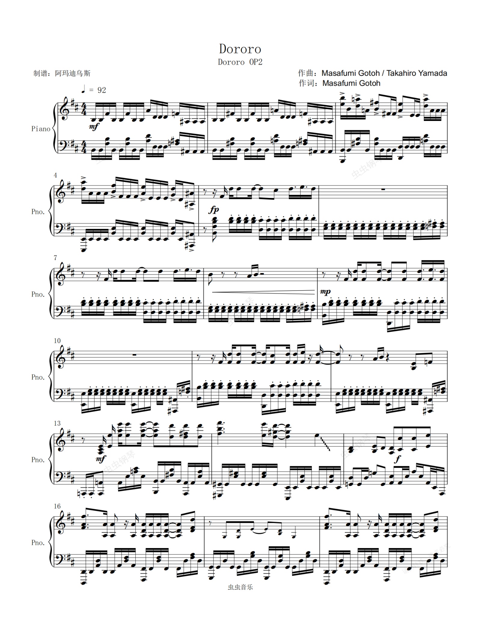 钢琴谱:多罗罗 OP2 < どろろ > Dororo 原调高还原完整版本