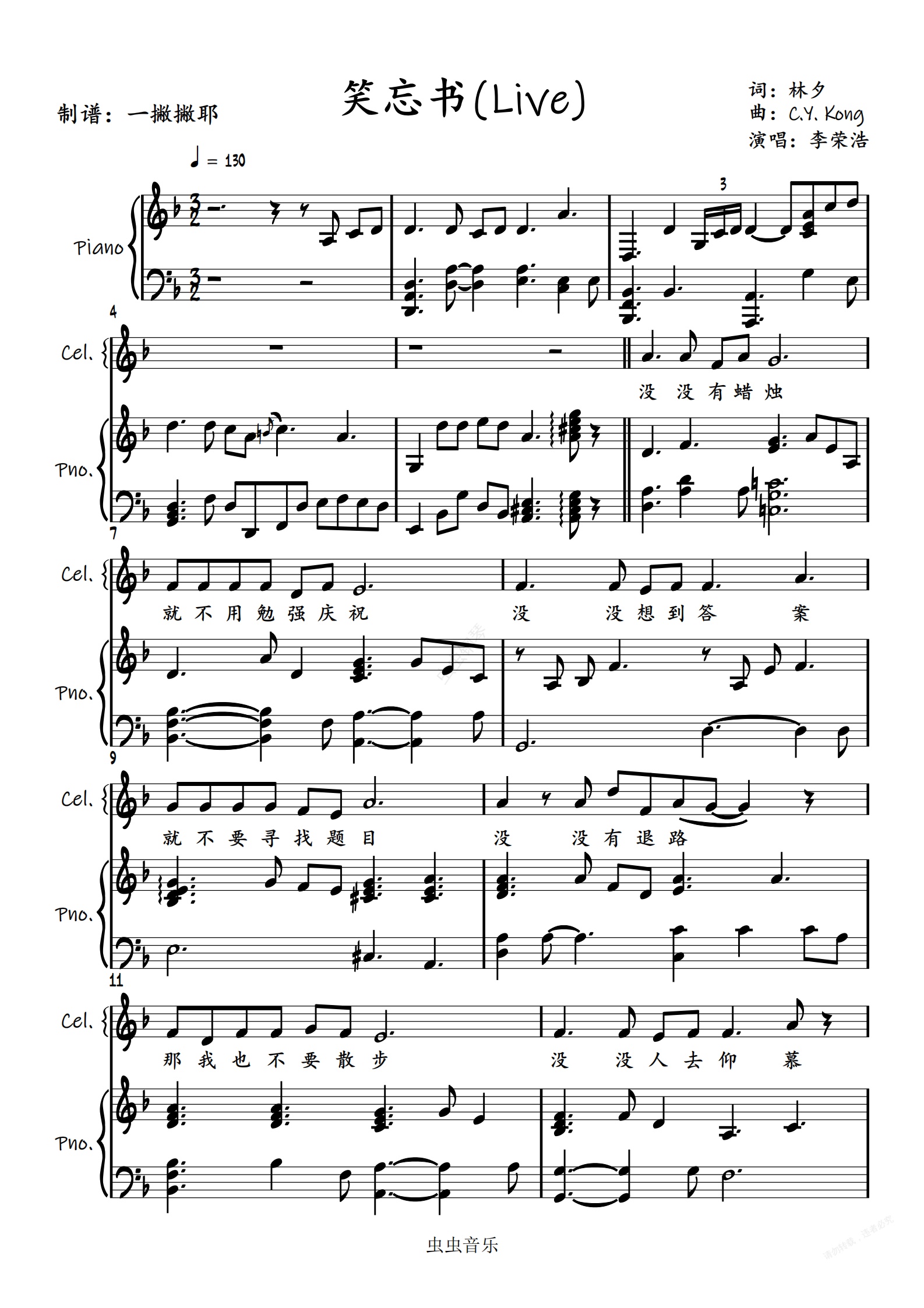 钢琴谱:笑忘书【降调版弹唱谱】李荣浩《我是歌手》「一撇撇耶」