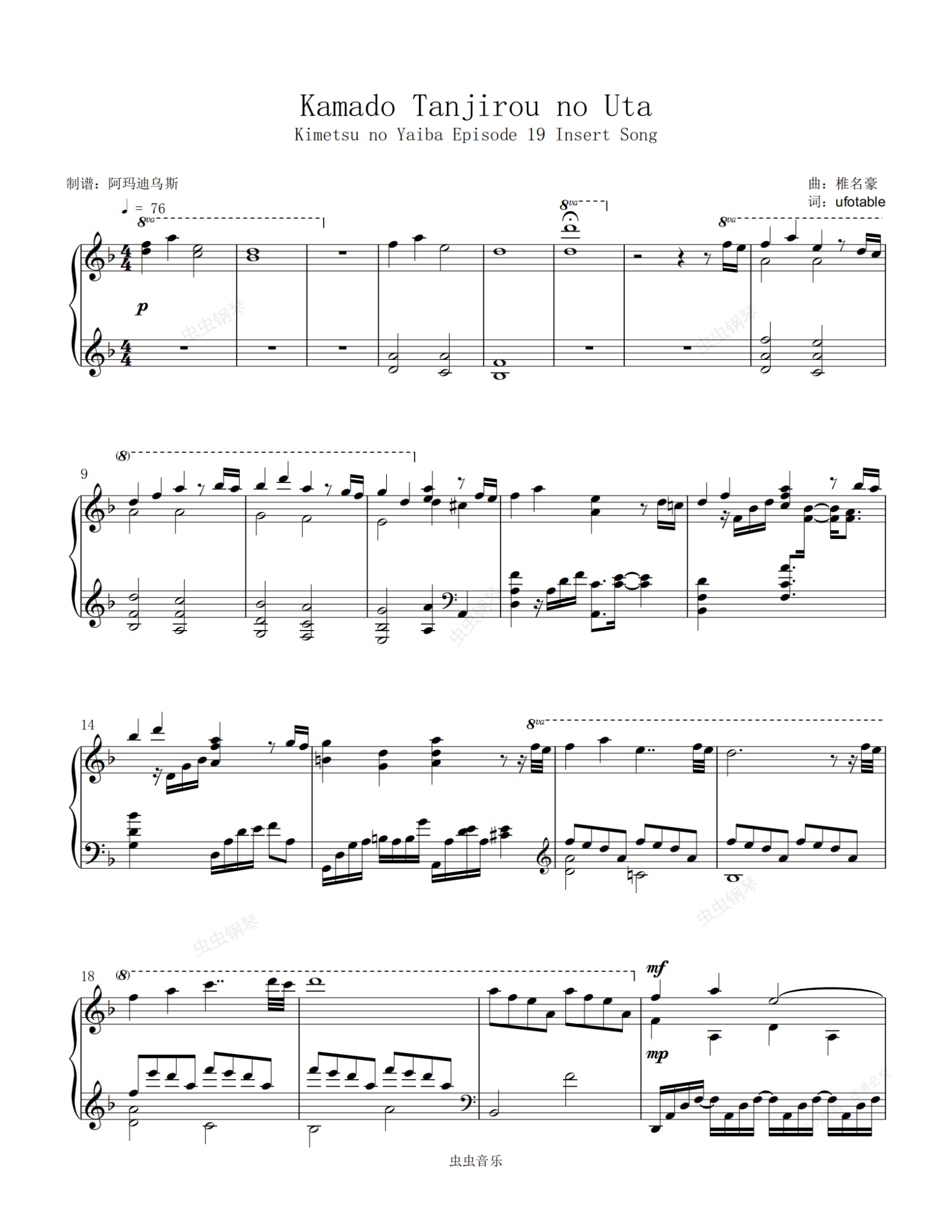 钢琴谱:鬼滅之刃 EP.19 ED < 竈門炭治郎のうた > 原调高还原完整版本