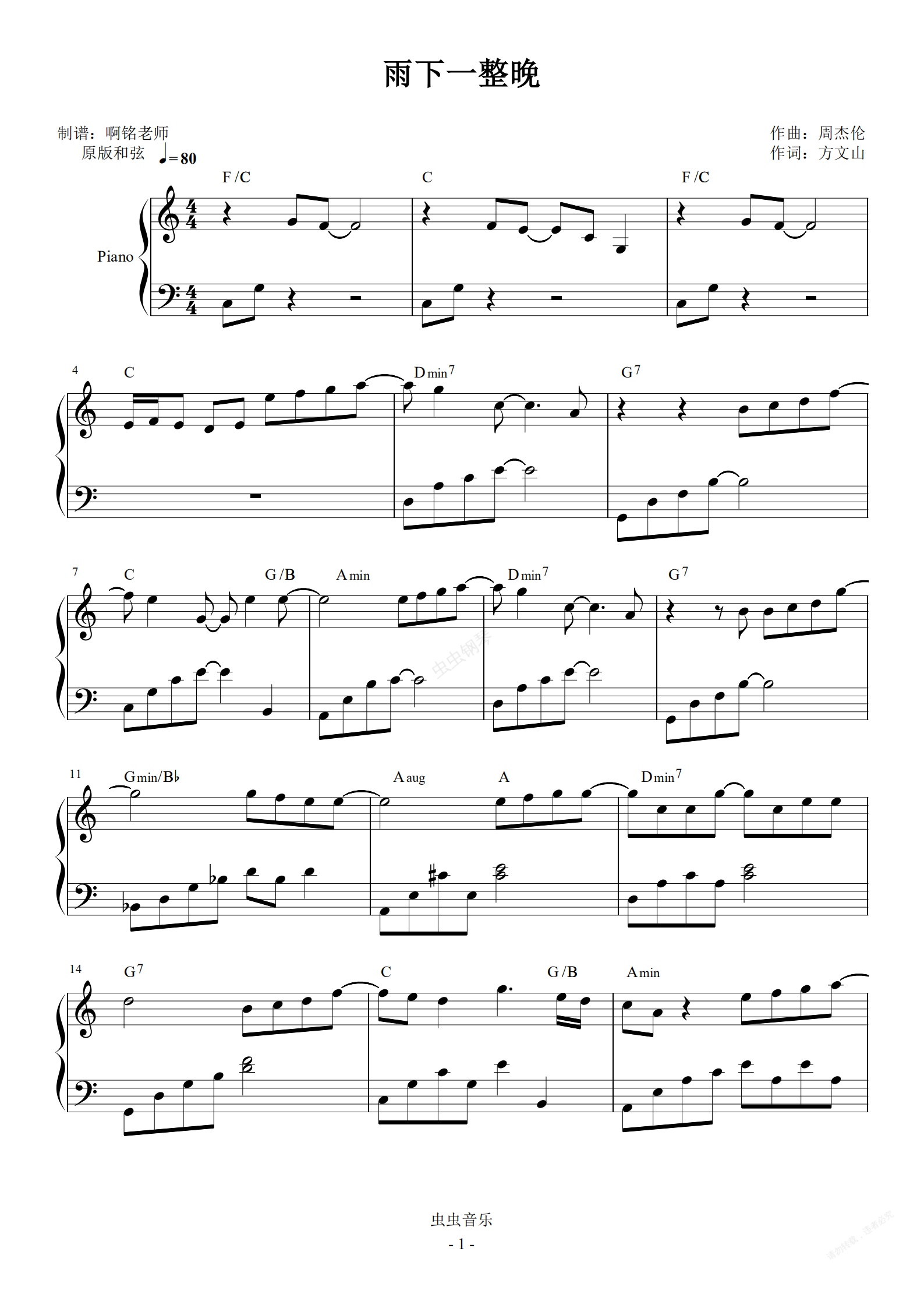 钢琴谱:雨下一整晚 C调完美演奏 原版和弦