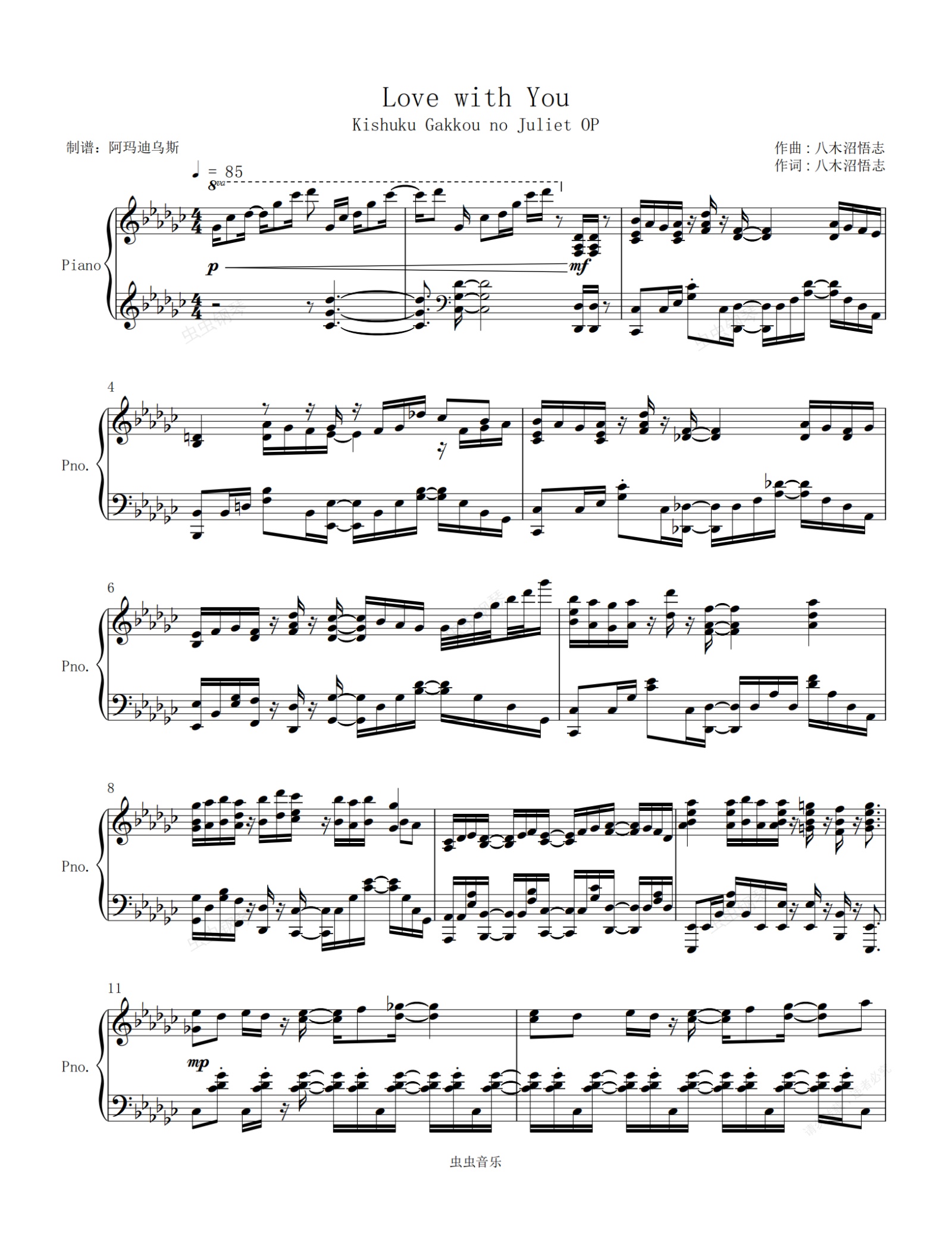 钢琴谱:寄宿学校的朱丽叶 OP < Love with You > 原调高还原完整版本
