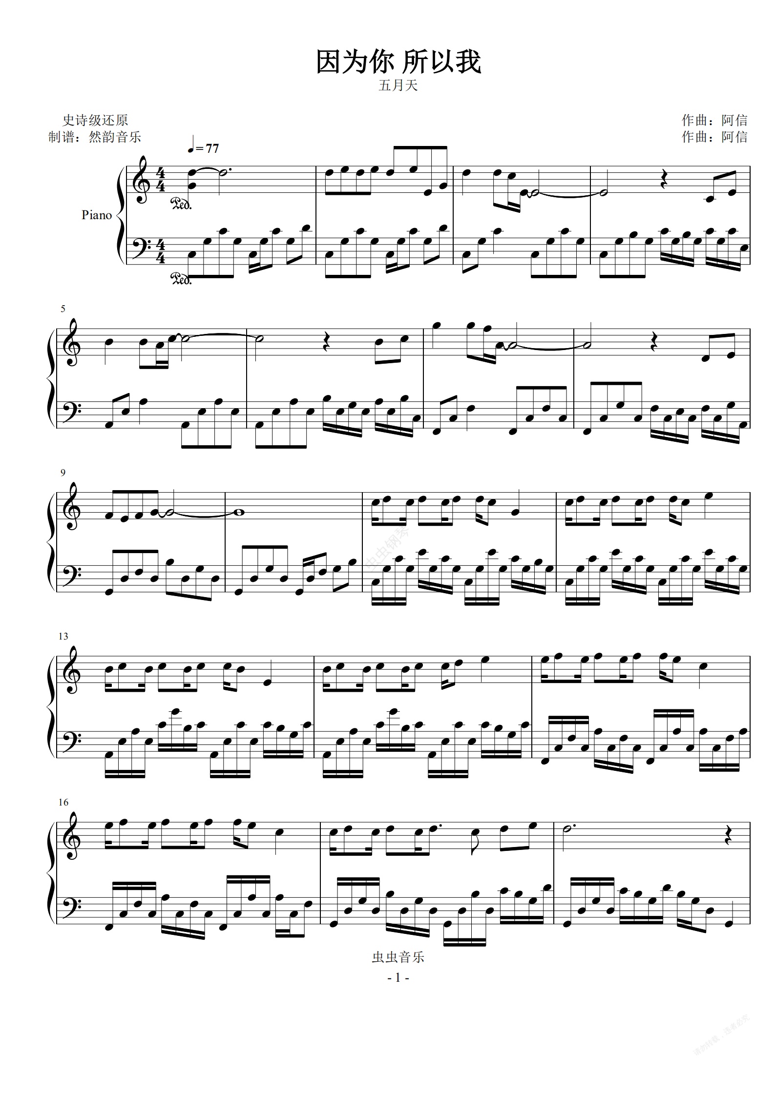 钢琴谱:因为你 所以我-五月天 C调 完美还原版