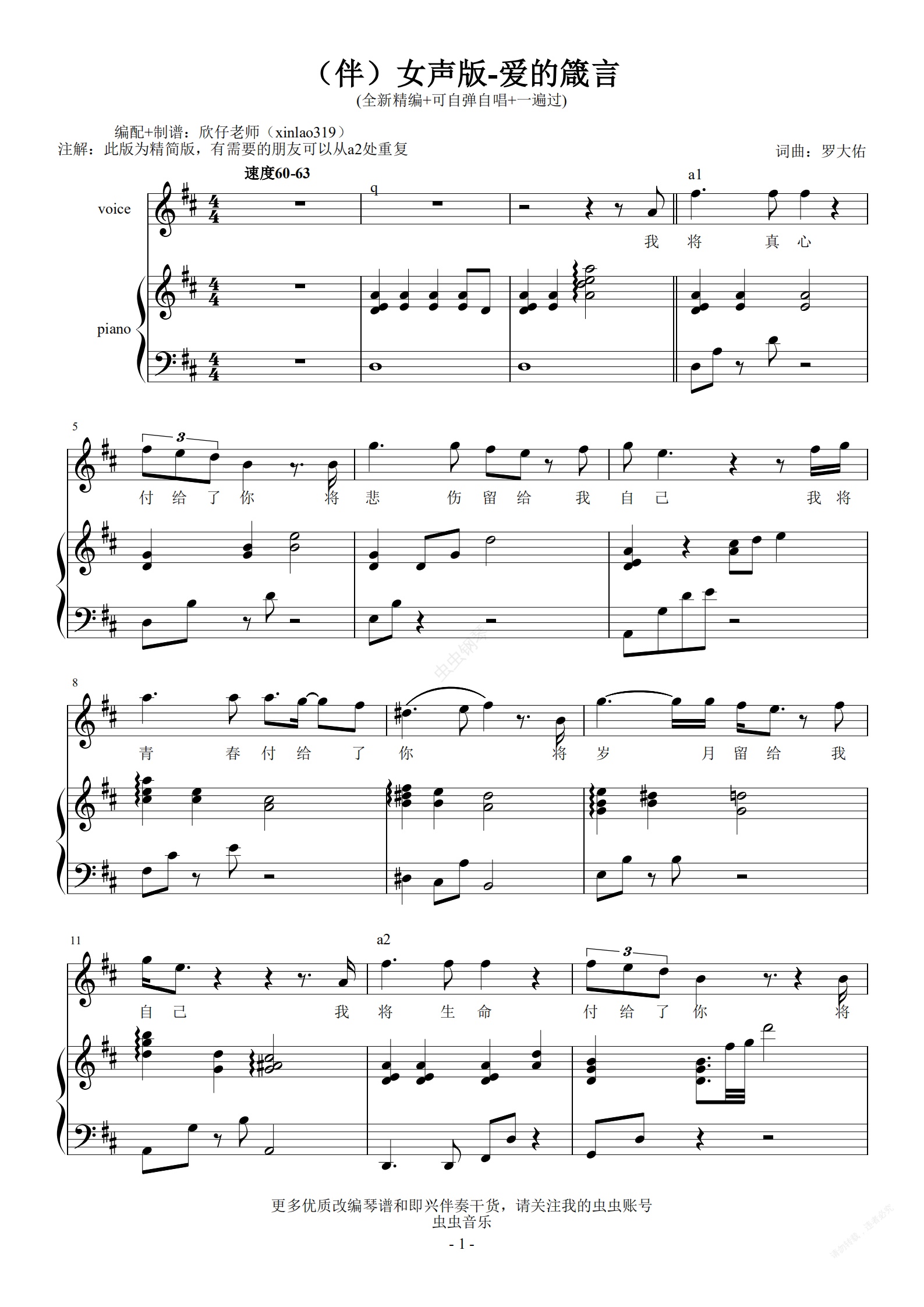 钢琴谱:(伴)D调女声-爱的箴言(全新精编+可自弹自唱+一遍过)