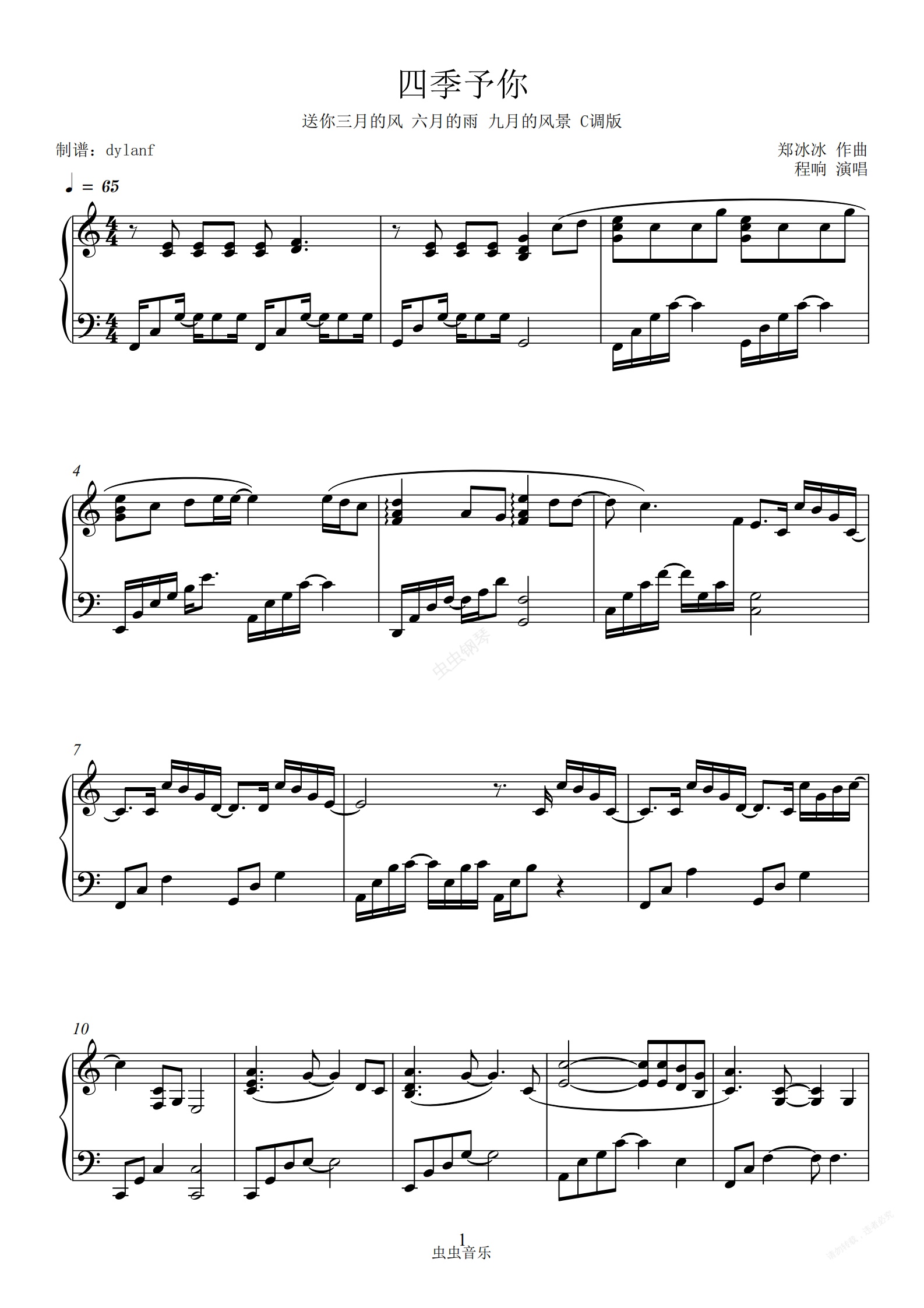 钢琴谱:C调易弹 超高还原编配 四季予你 程响