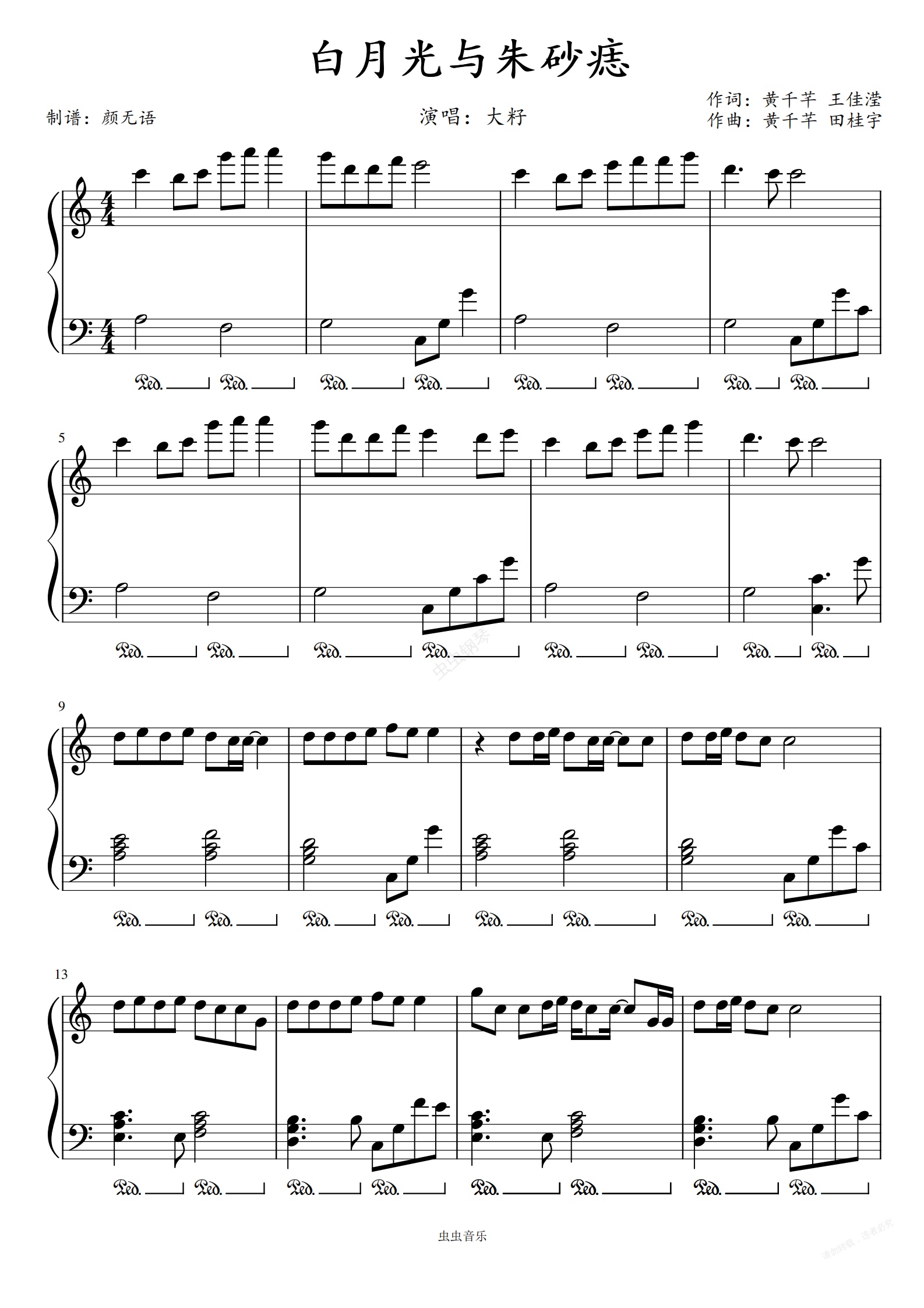 钢琴谱:白月光与朱砂痣 C调 有感觉的