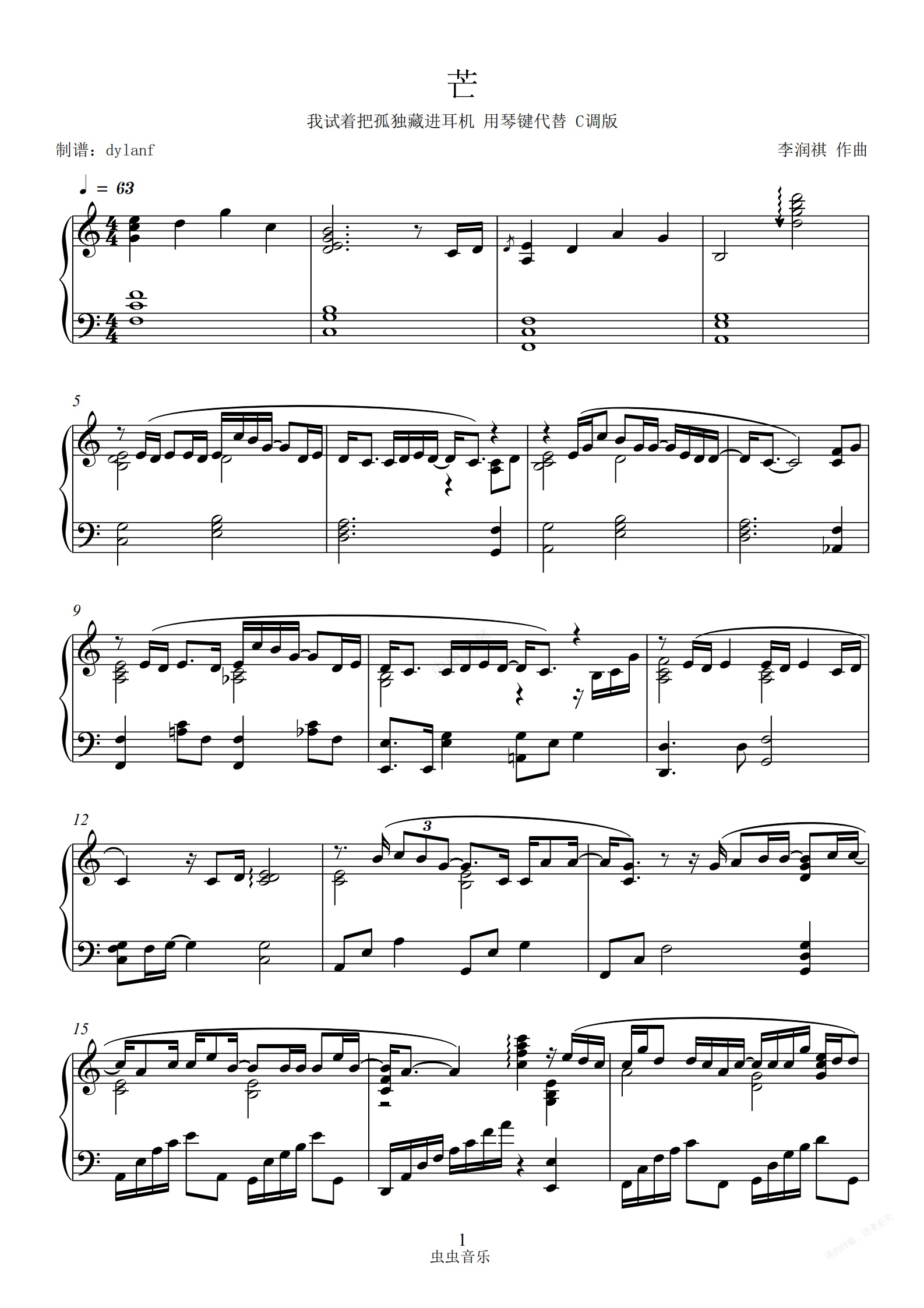 钢琴谱:C调易弹 超高还原编配 茫 李润祺