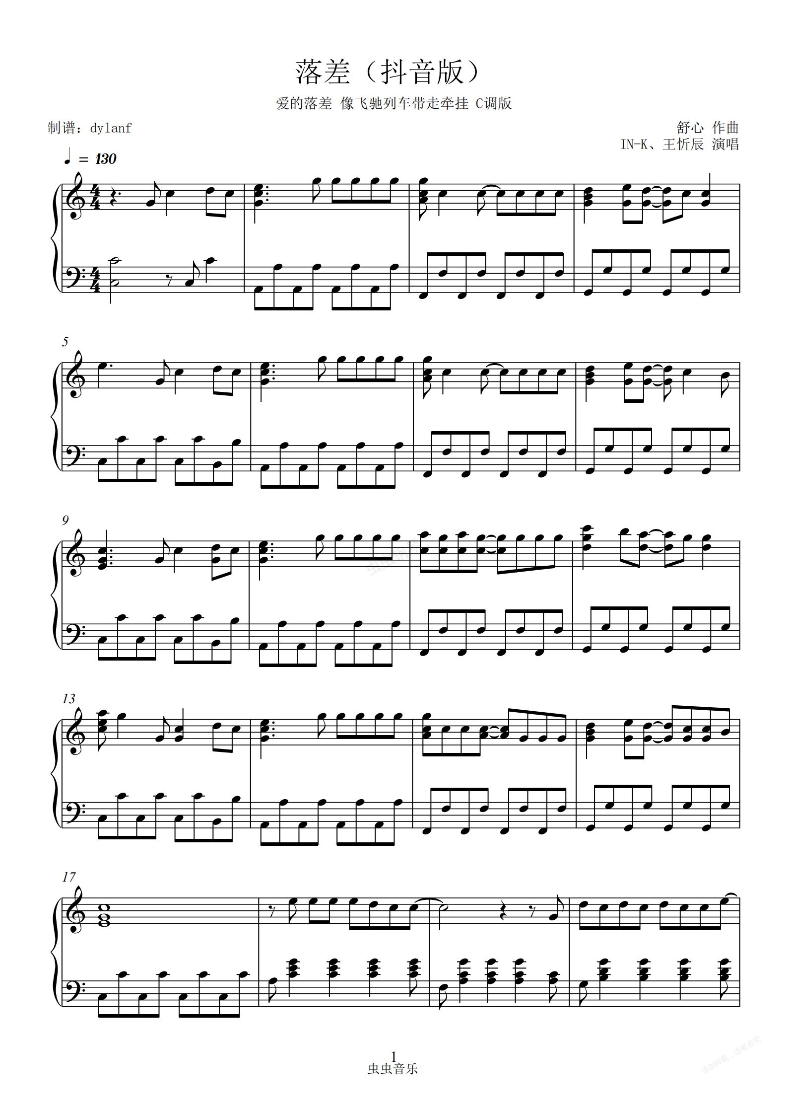 钢琴谱:C调易弹 落差(抖音版)好听还原