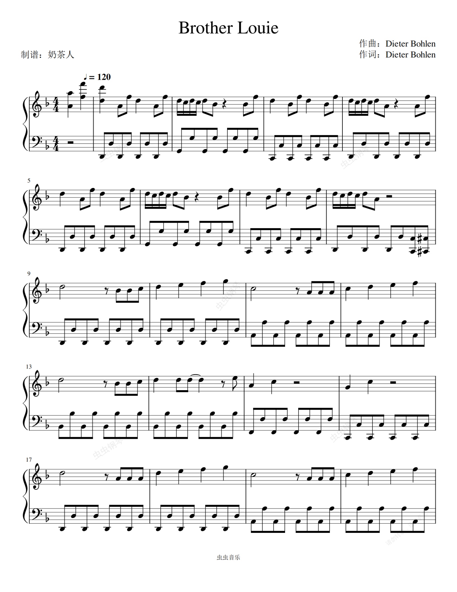钢琴谱:《Brother Louie》 中文翻唱为《路灯下的小姑娘》金曲