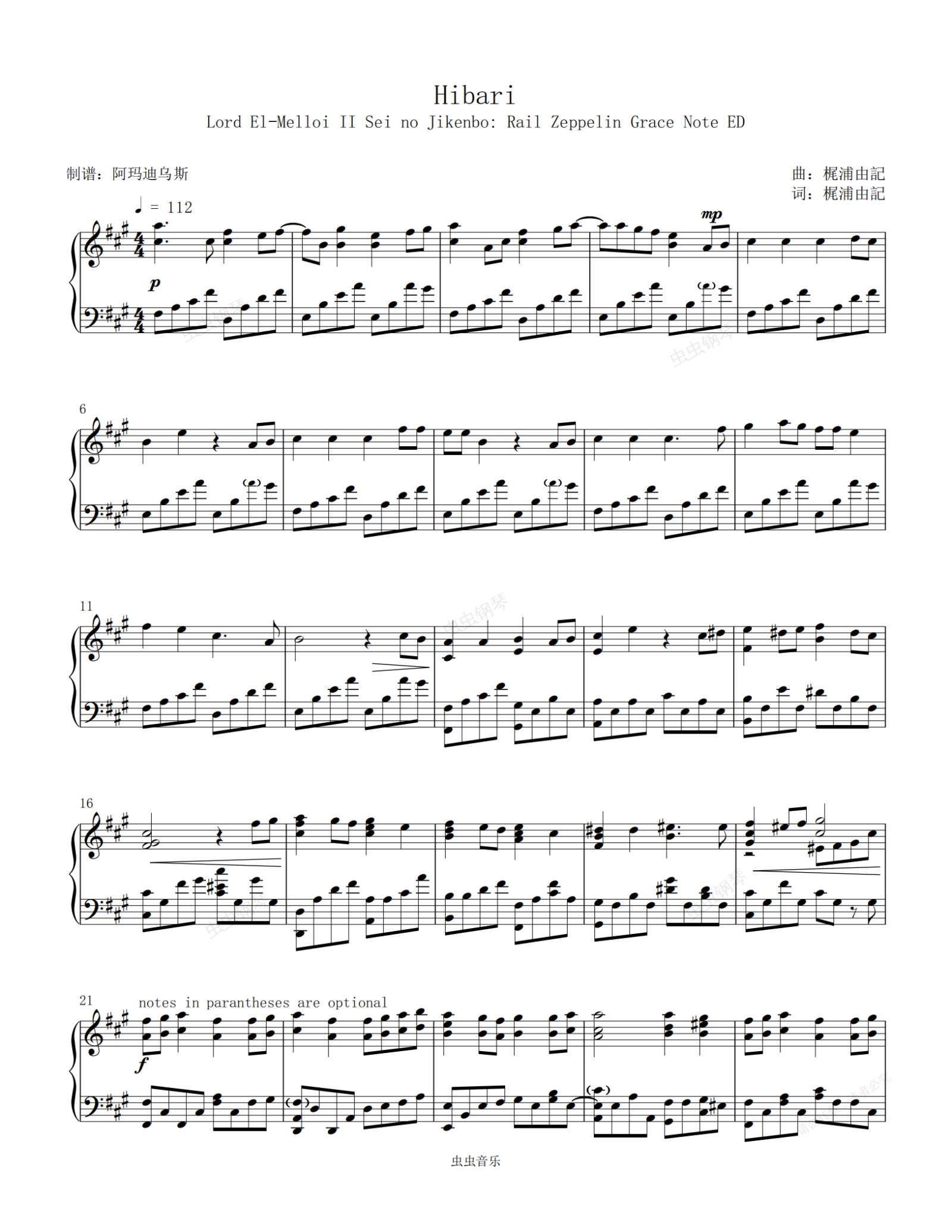 钢琴谱:君主·埃尔梅罗二世事件簿 ED < 云雀 > 原调高还原完整版本