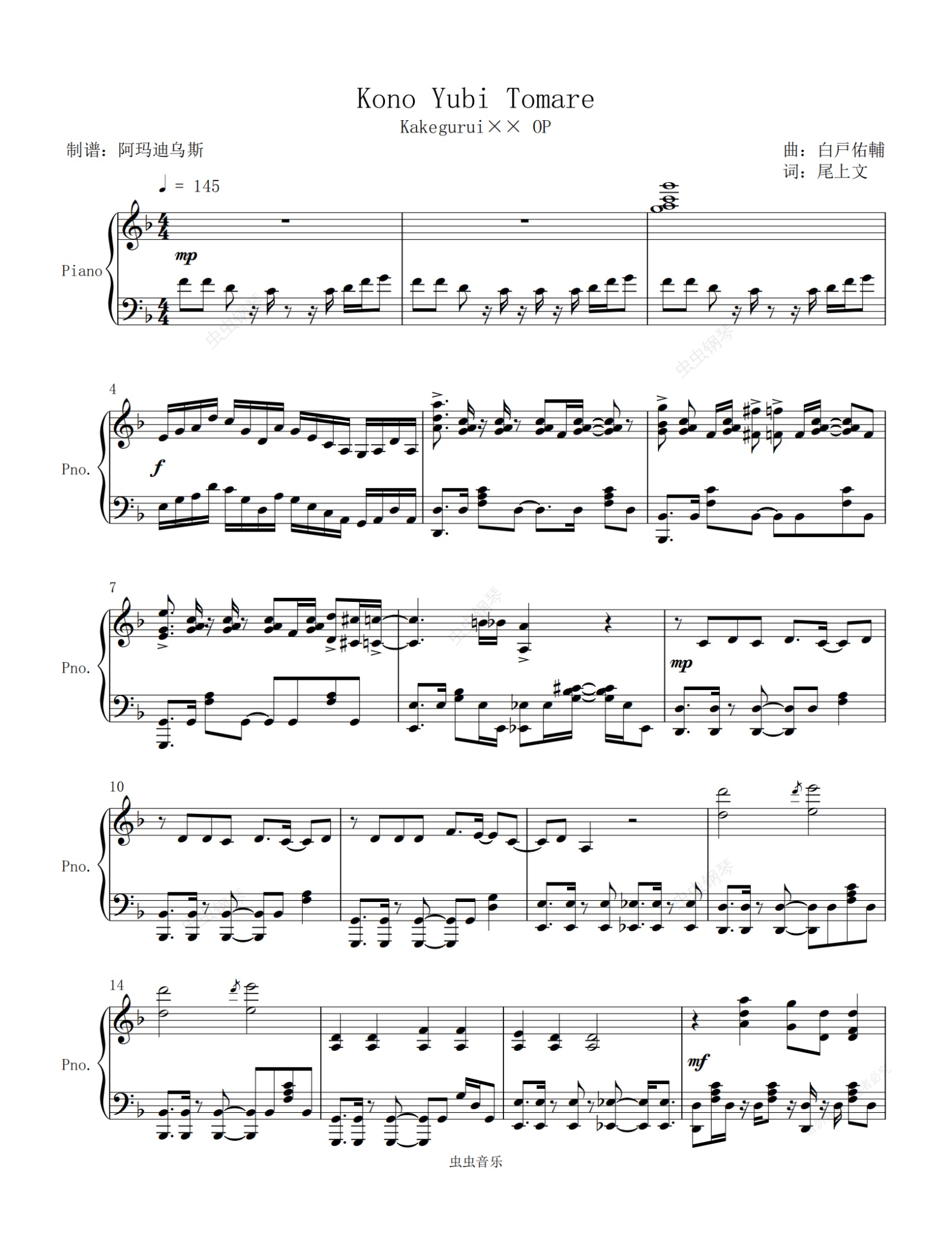 钢琴谱:狂赌之渊 OP < コノユビトマレ > 让手指停下 原调高还原完整版本