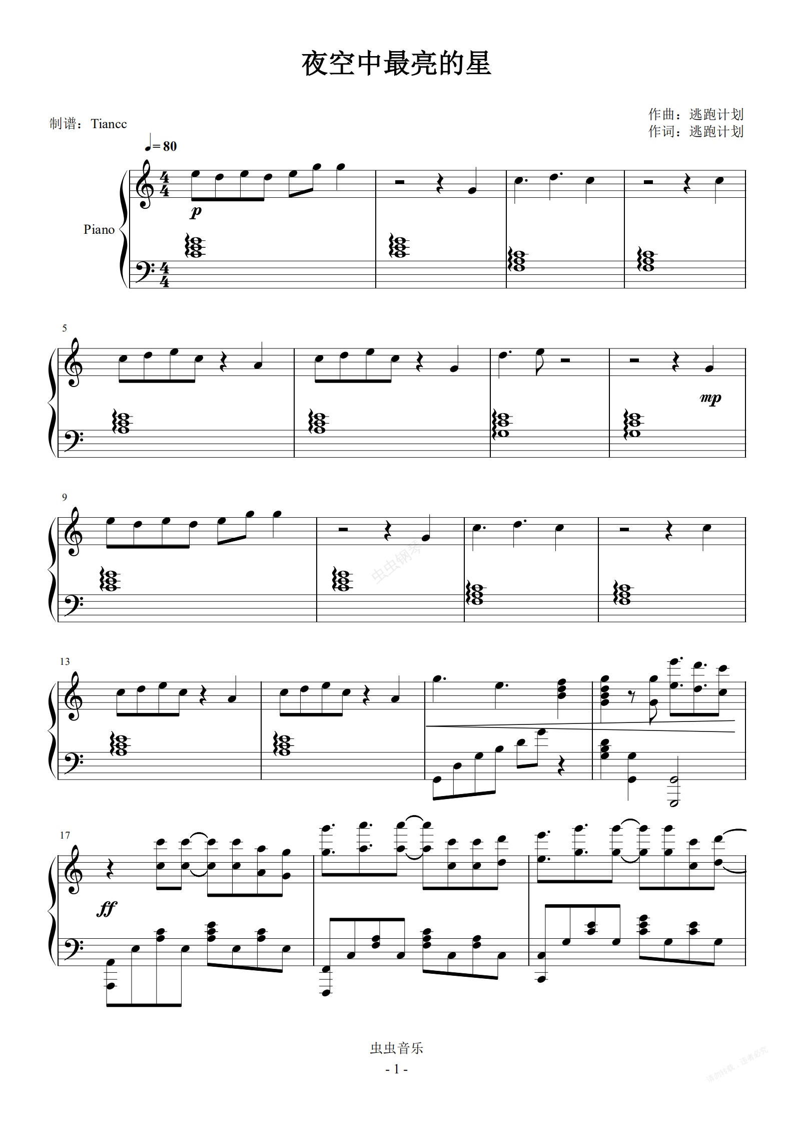 钢琴谱:《夜空中最亮的星》钢琴独奏谱,C调849难度,还是独奏的好