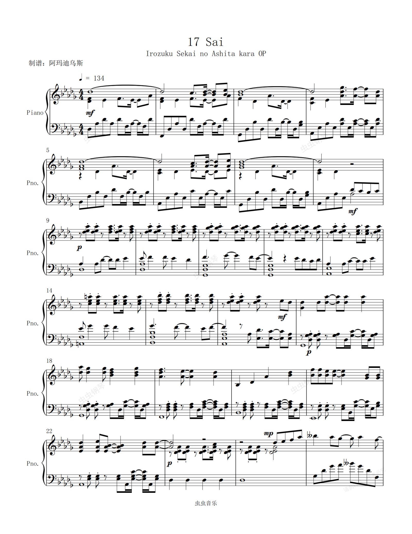 钢琴谱:来自多彩世界的明天 OP < 17才 > 原调高还原完整版本