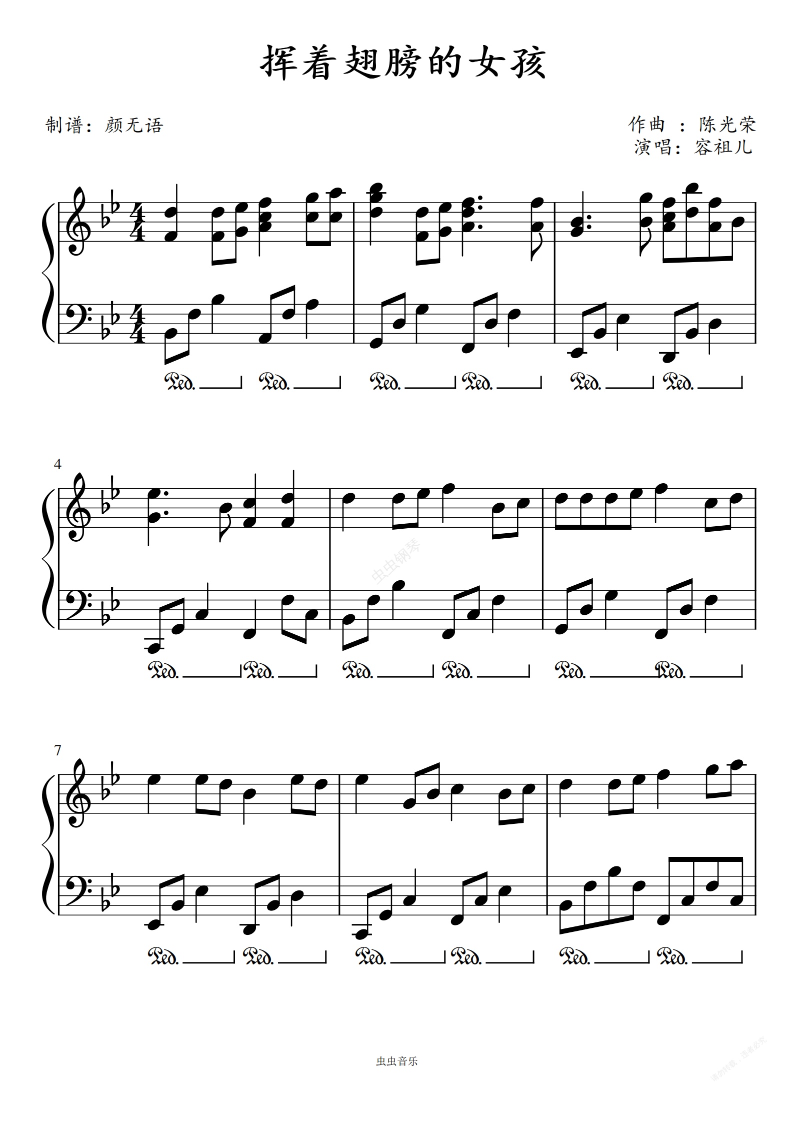 钢琴谱:挥着翅膀的女孩 降B调 怀旧