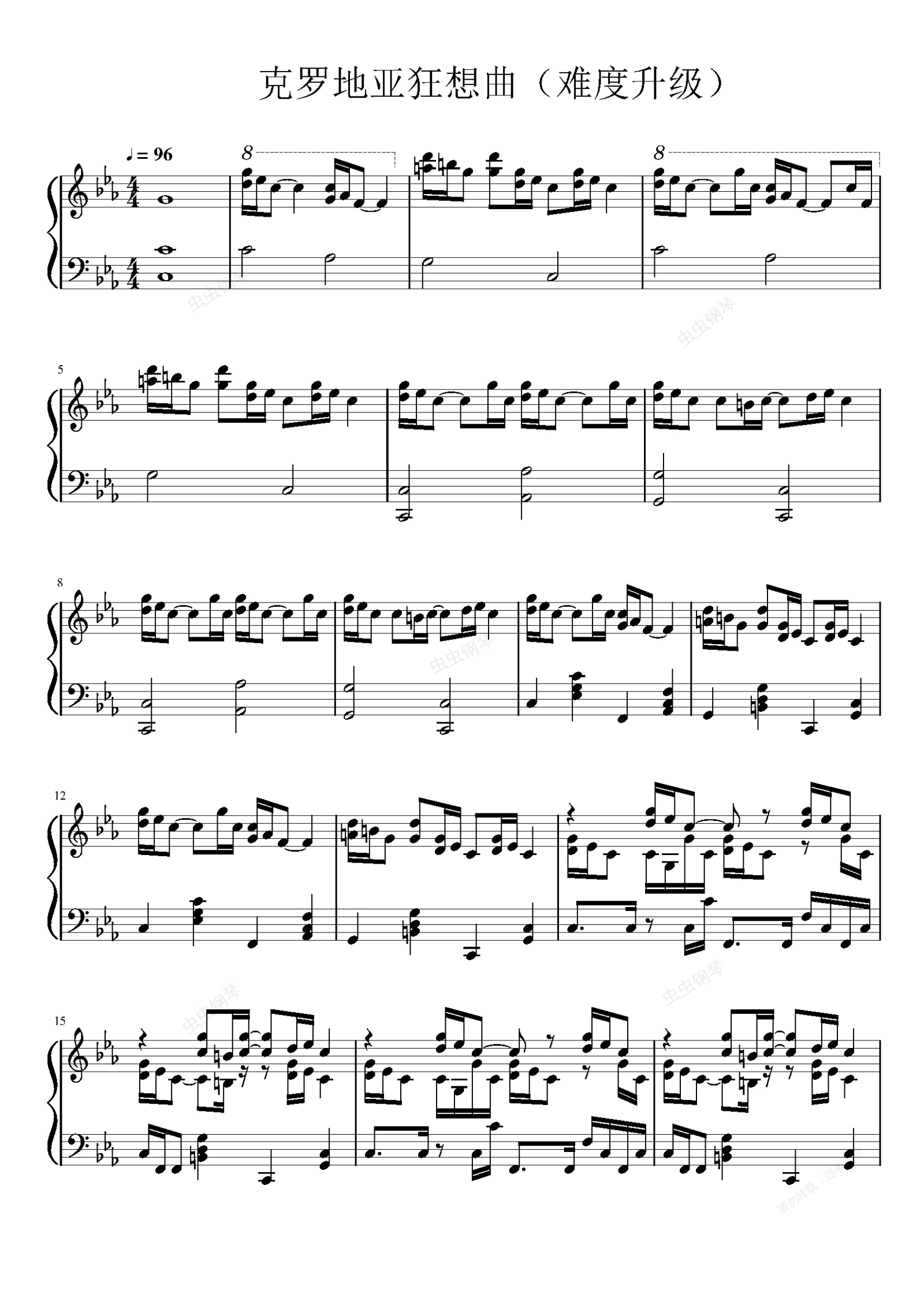 我改编这首曲子的初衷是觉得纯钢琴版有点单调,然而本人菜得很,也没让它丰富多少。。。但是难度,确实大大升级了,个人认为难度已经达到了接近肖邦李斯特的级别。要弹,不需要太大的手,八度小手即可,但需要非常好的基本功(其实可以把我改的这个当做八度练习曲2333)。试听音频里,转调之后有一部分很乱,是因为这个地方是右手同时控制两个声部,而音频是电脑弹的,很机械,搞得就像两个声部比音量大小一样,人手来弹绝对没有这个问题。。。本人非常菜,如果乐谱有误,请指出,感谢!