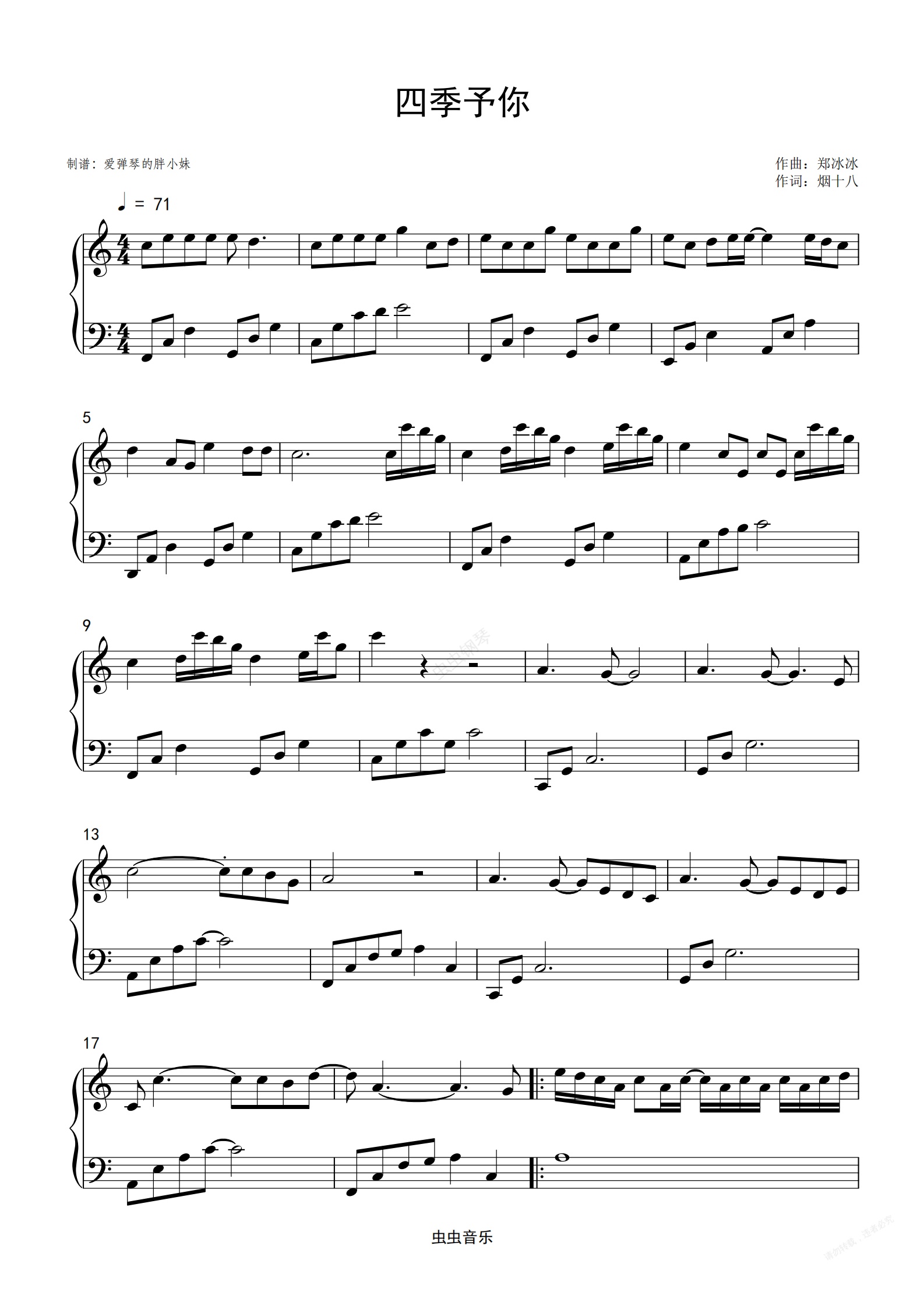 钢琴谱:四季予你-程响-初学者C调双手简谱