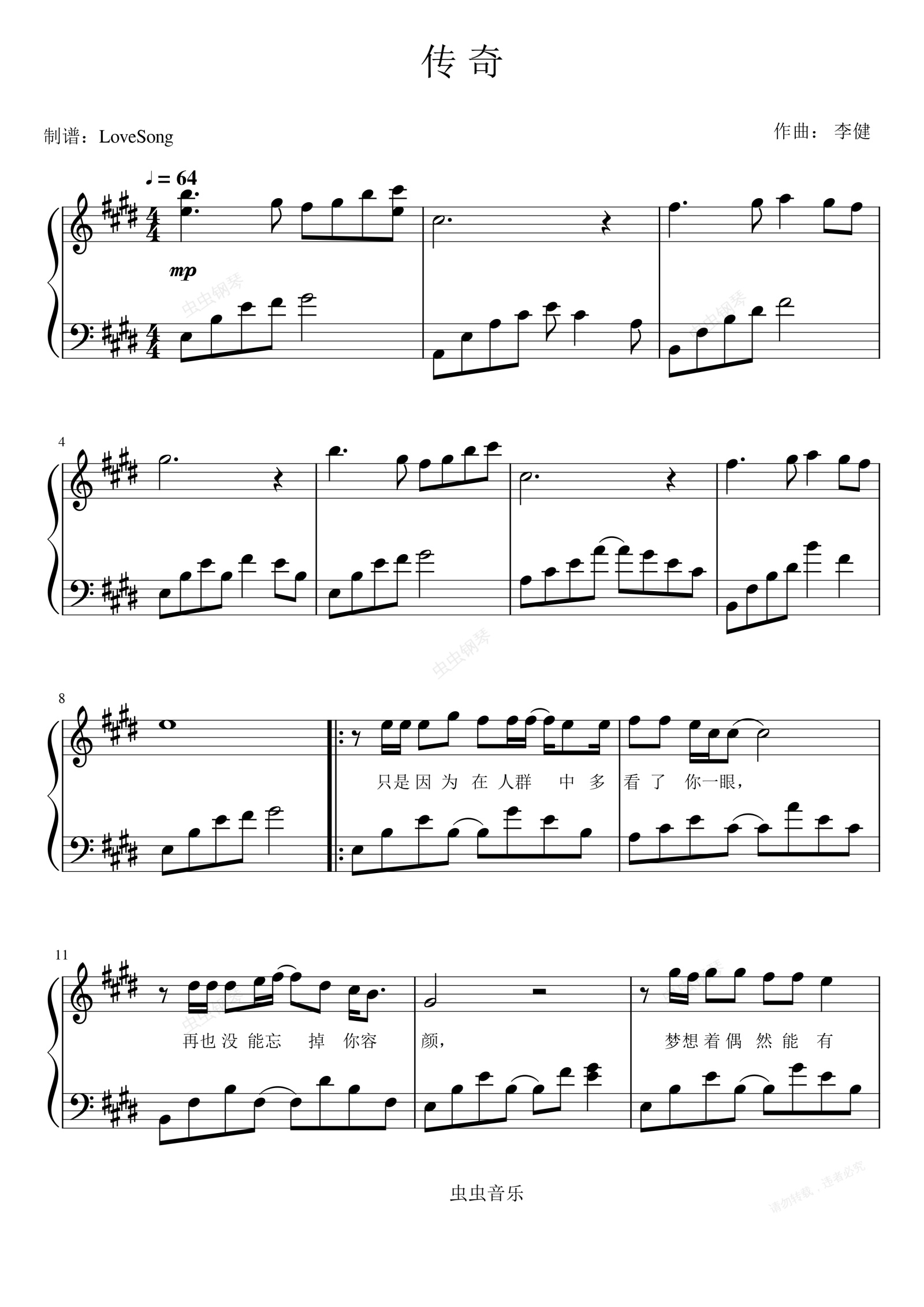 钢琴谱:王菲 传奇 演奏版 带歌词