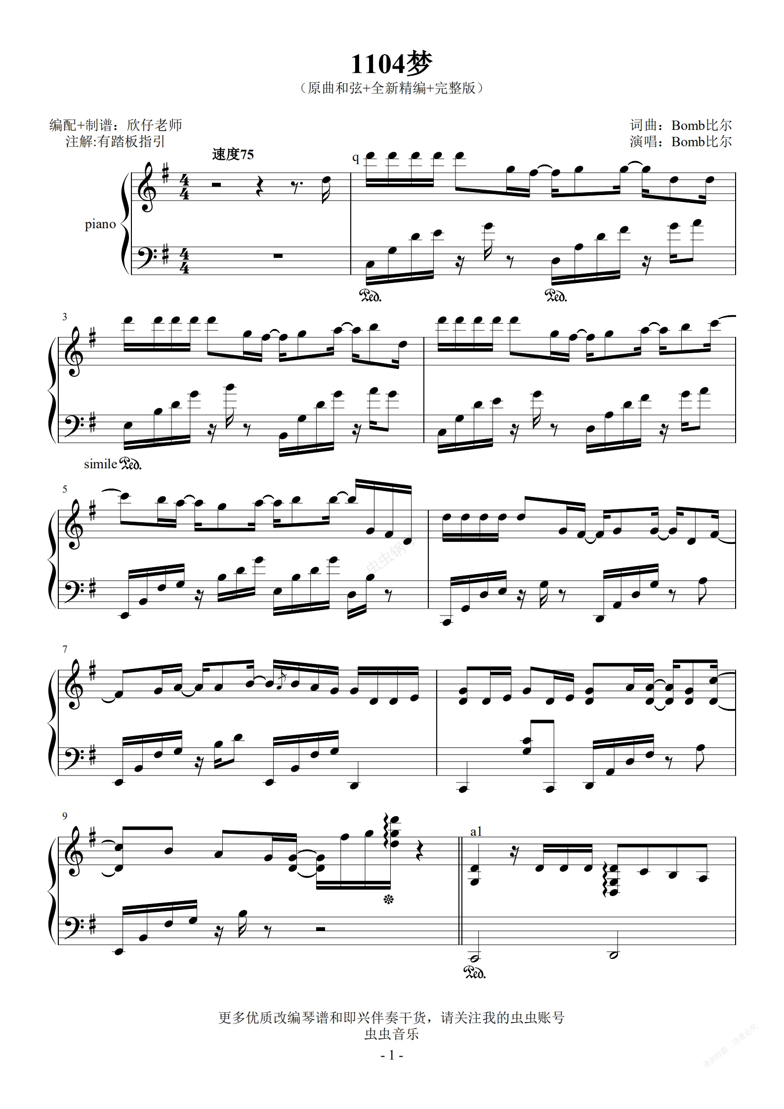 钢琴谱:Bomb比尔的歌-G调-1104梦(原曲和声+全新精编+完整版)