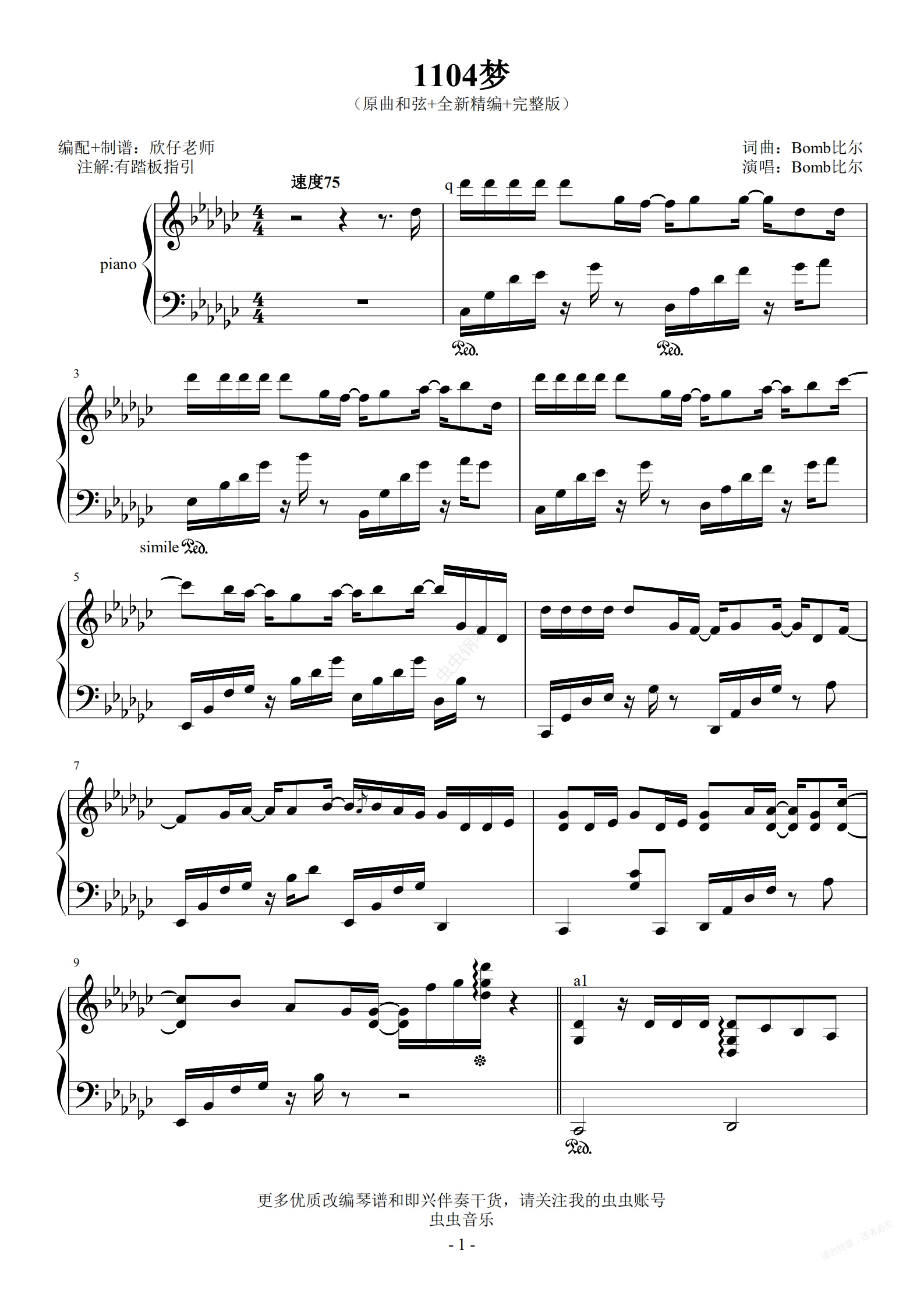 钢琴谱:比尔的歌-降G-1104梦(原曲和弦+全新精编+完整版)