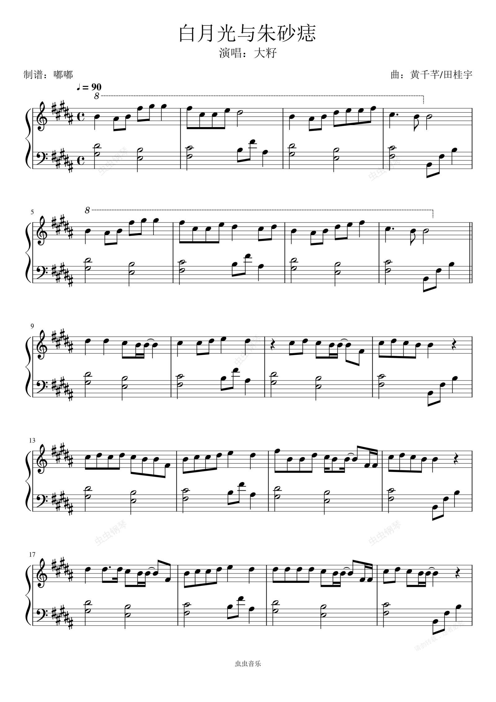 钢琴谱:白月光与朱砂痣(完整简单版) - 大籽