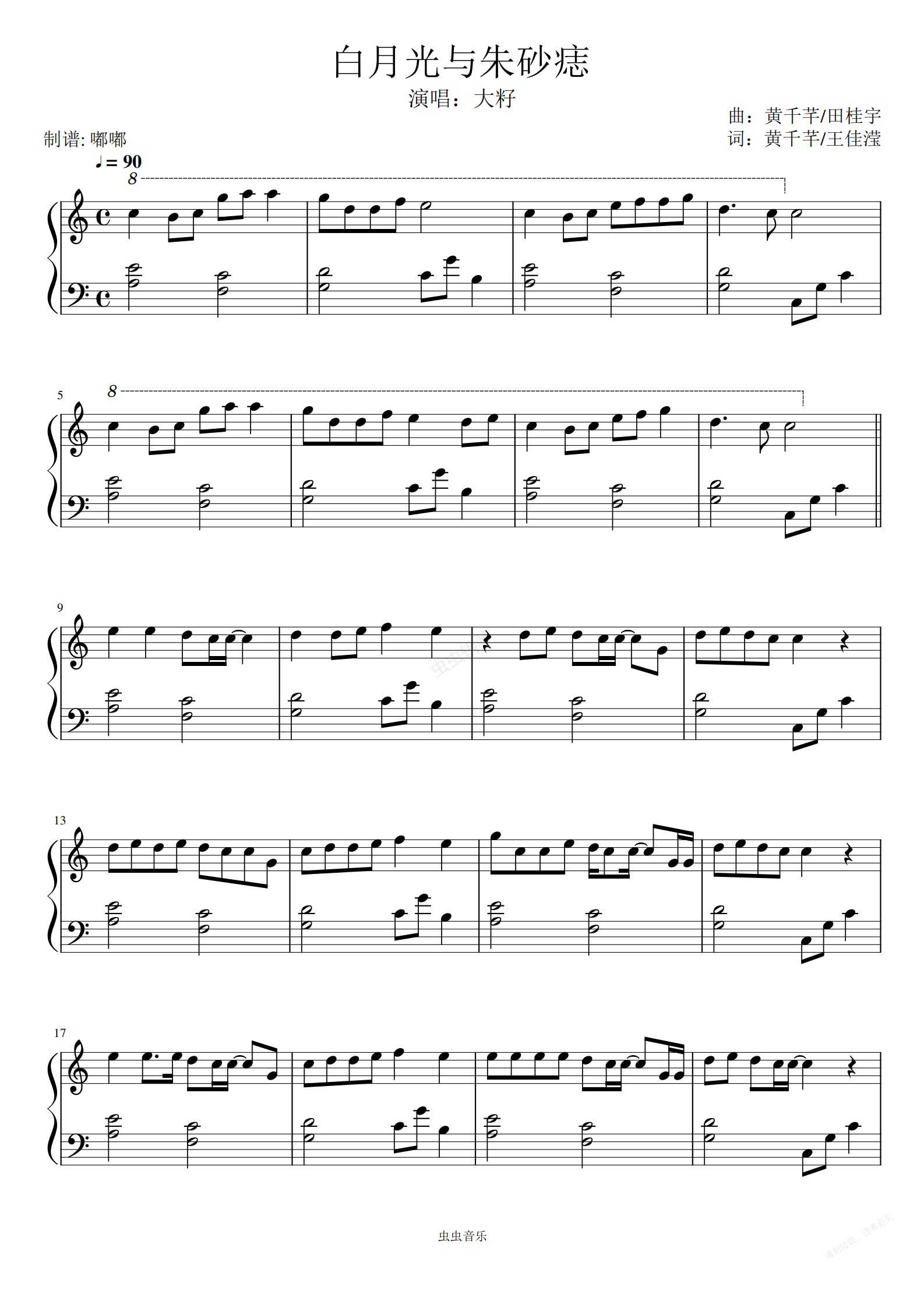钢琴谱:白月光与朱砂痣(完整简单C调版) - 大籽