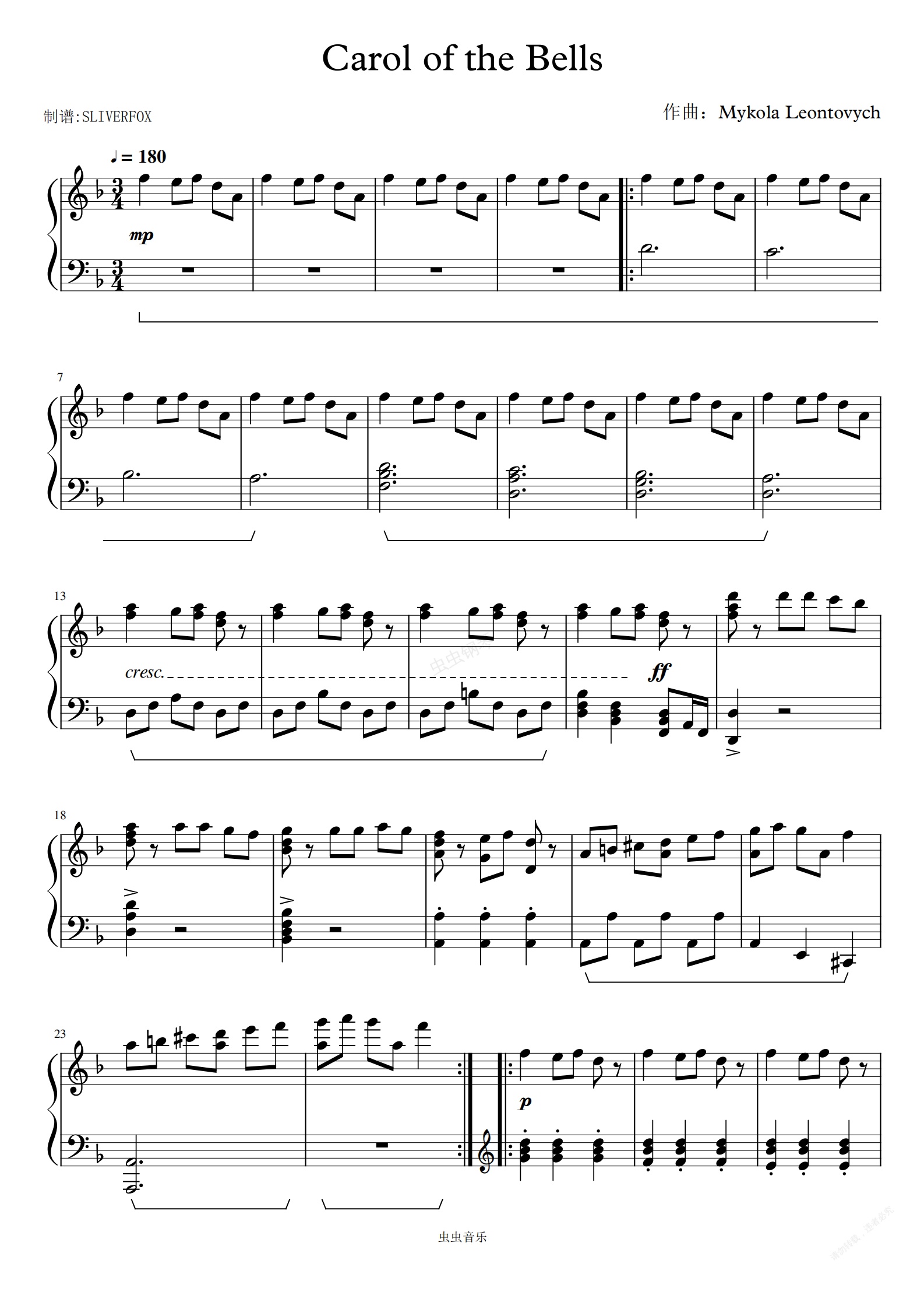 钢琴谱:《Carol of the Bells》钟声颂歌唯美简易版