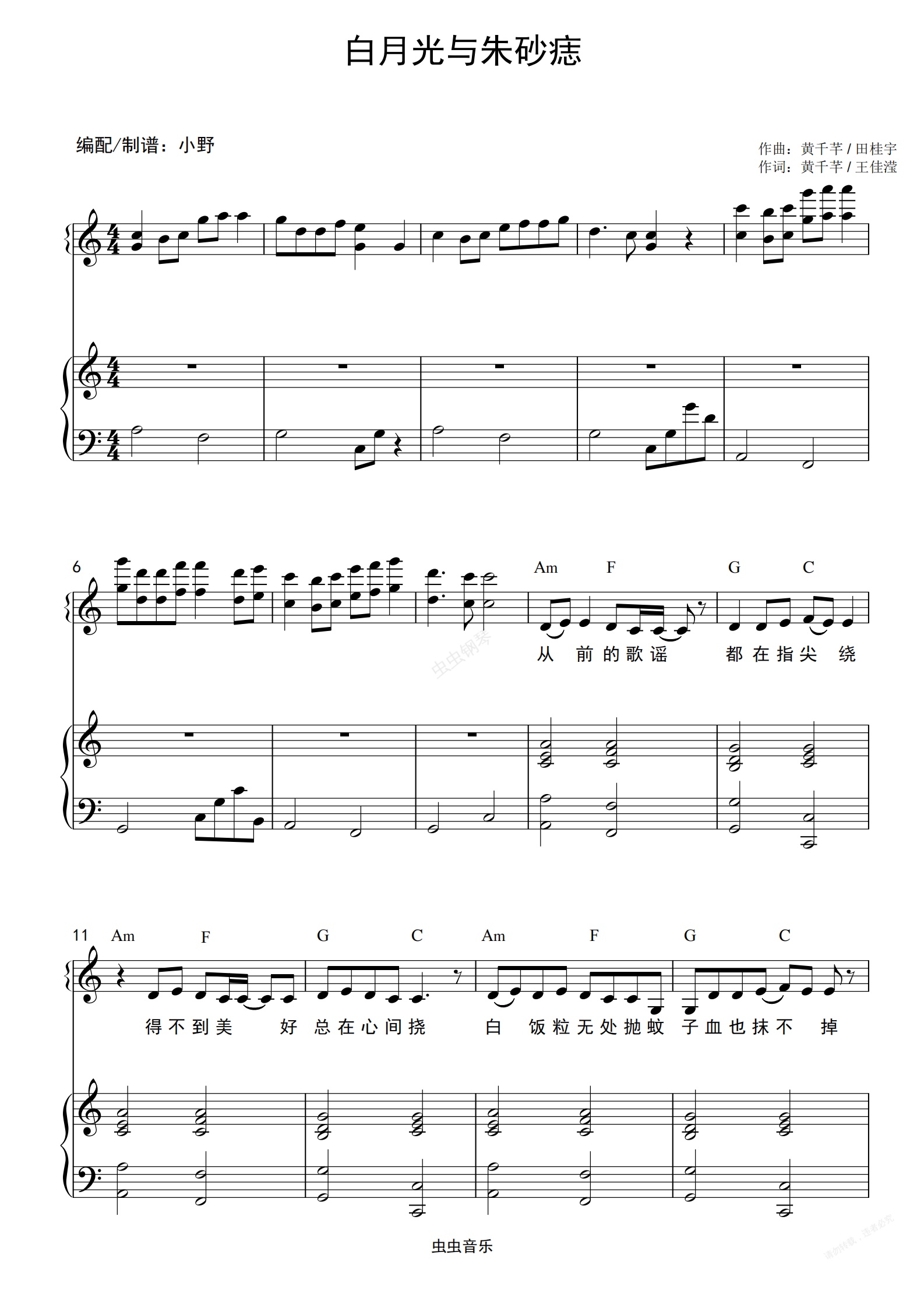 钢琴谱:白月光与朱砂痣(和弦弹唱版)