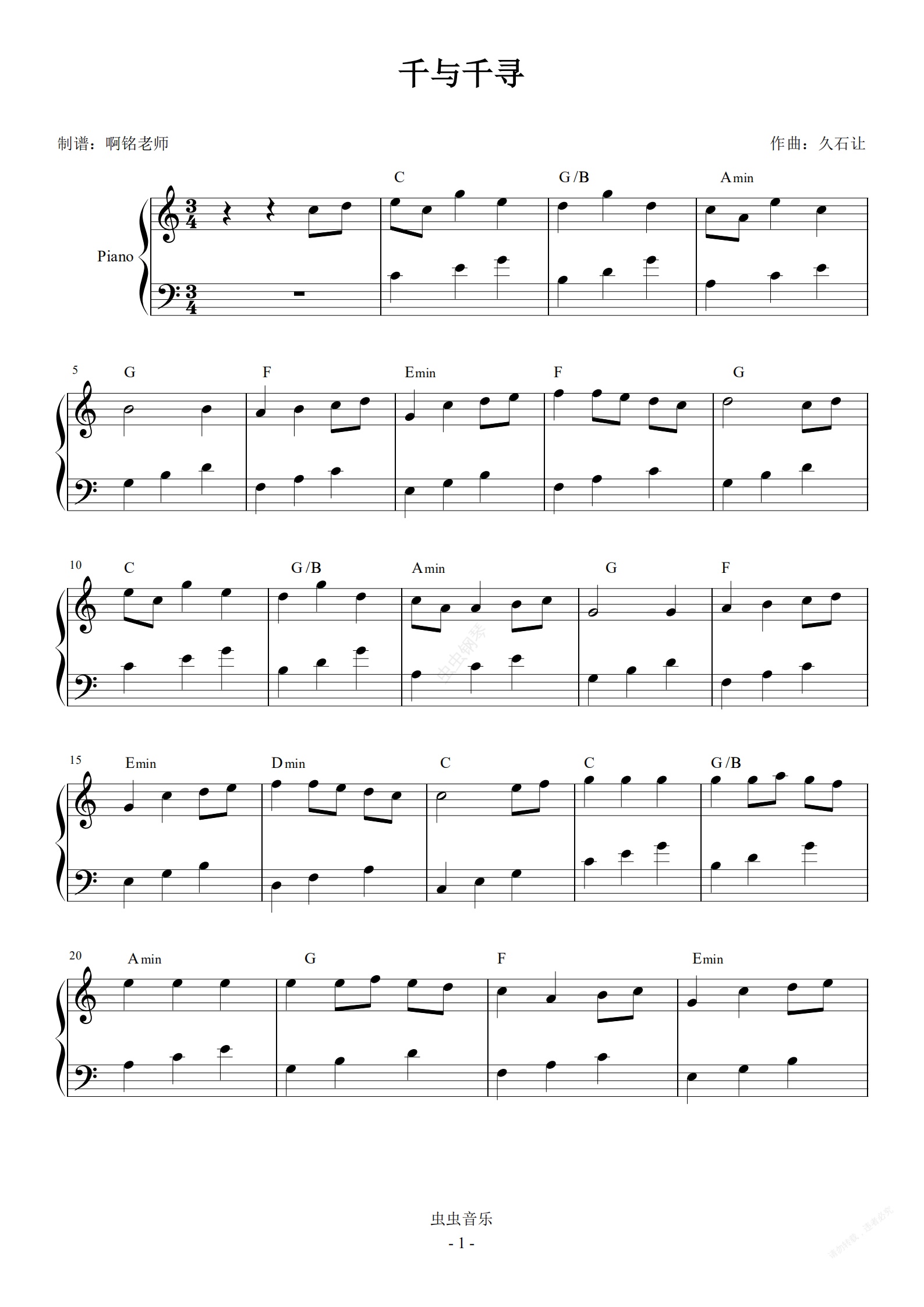 钢琴谱:One Summer's Day 千与千寻 C调简易 小汤3难度